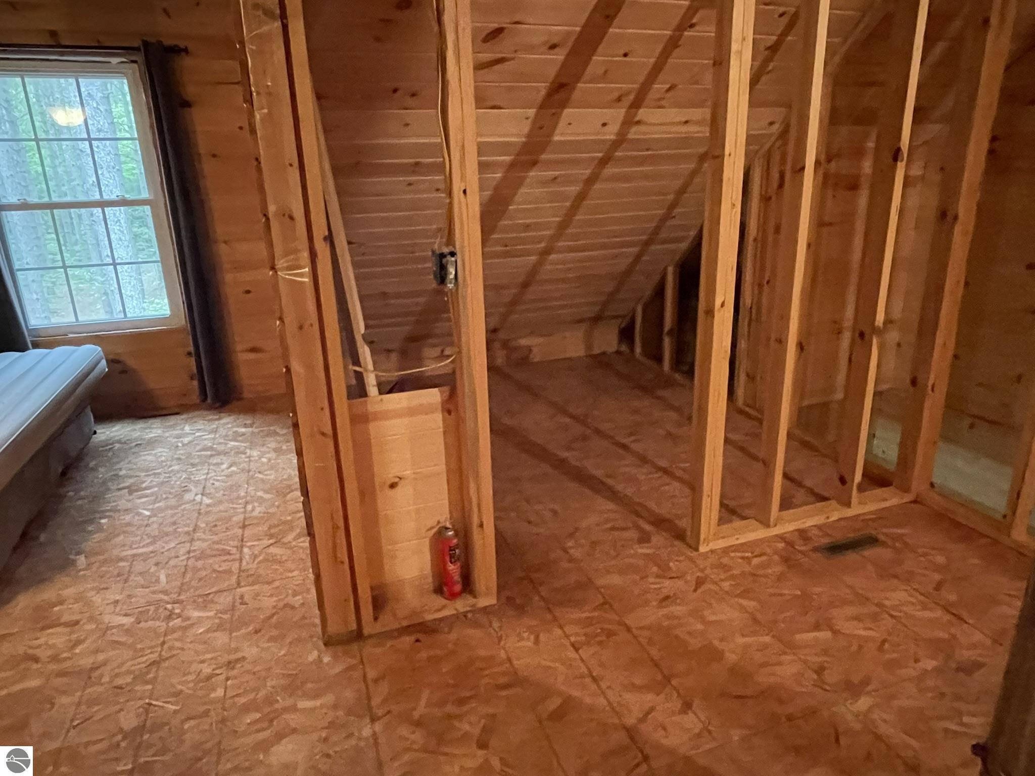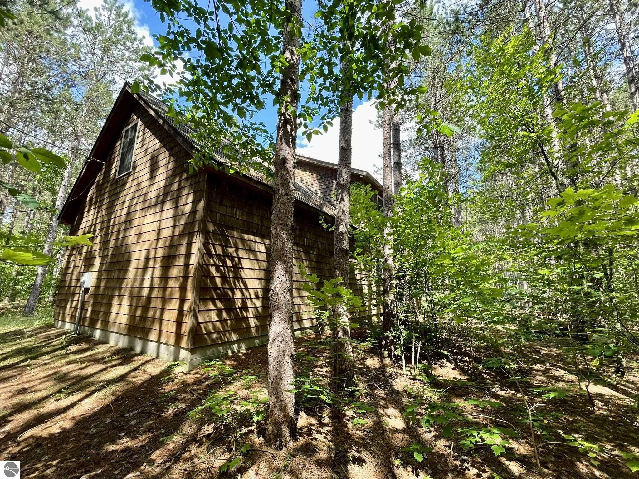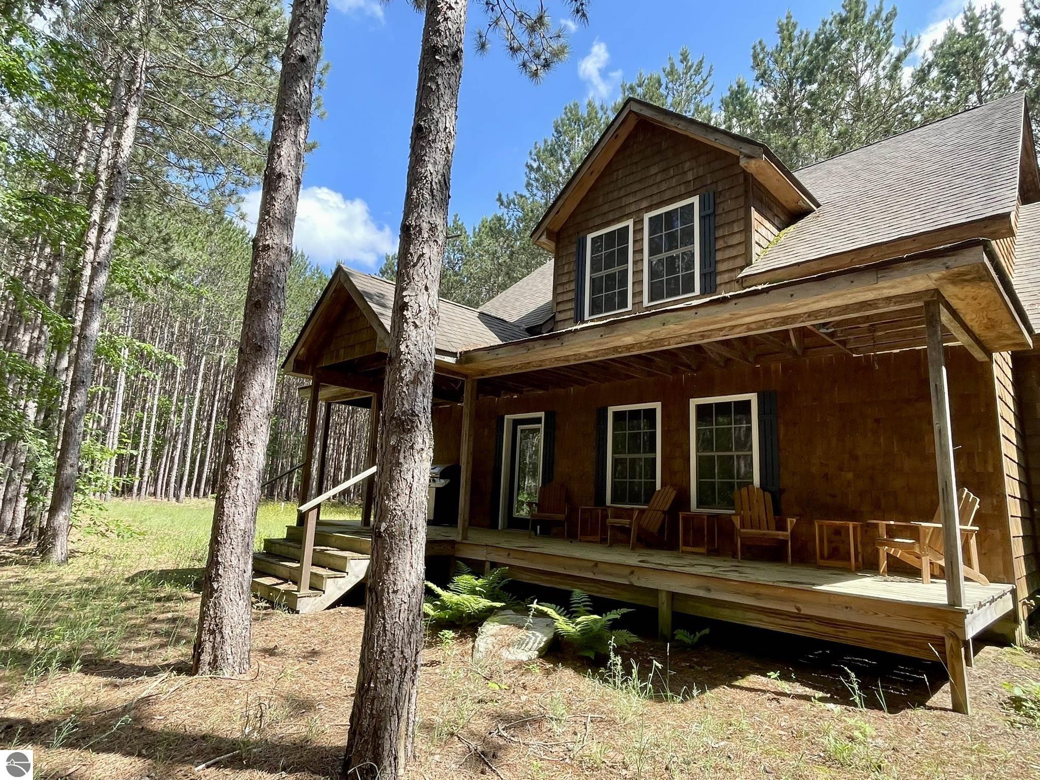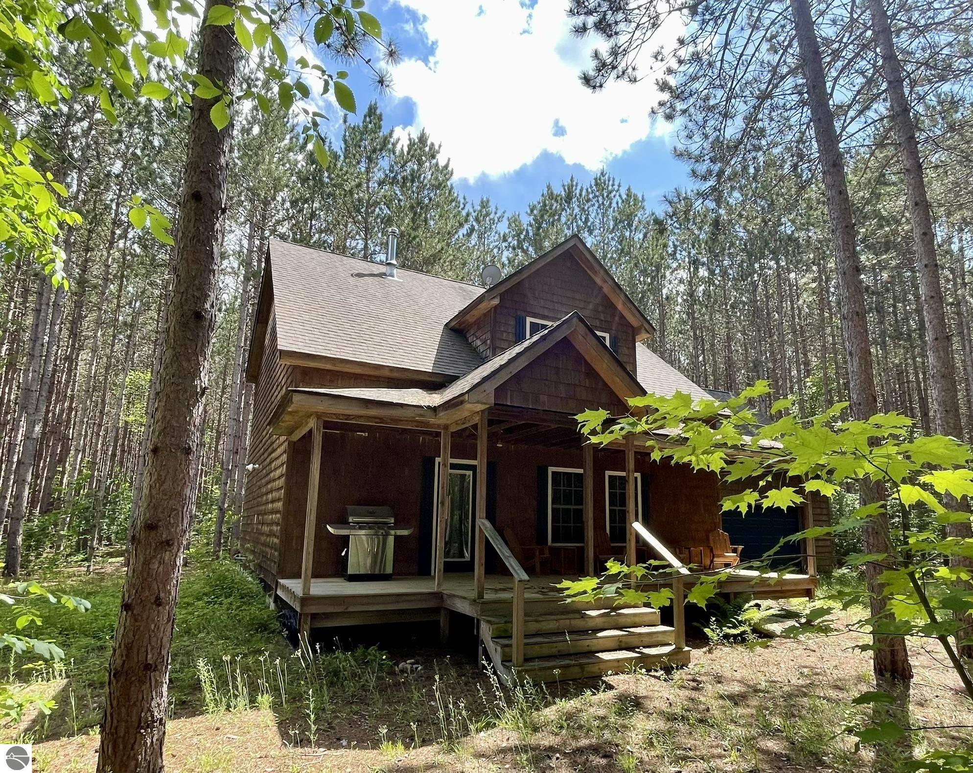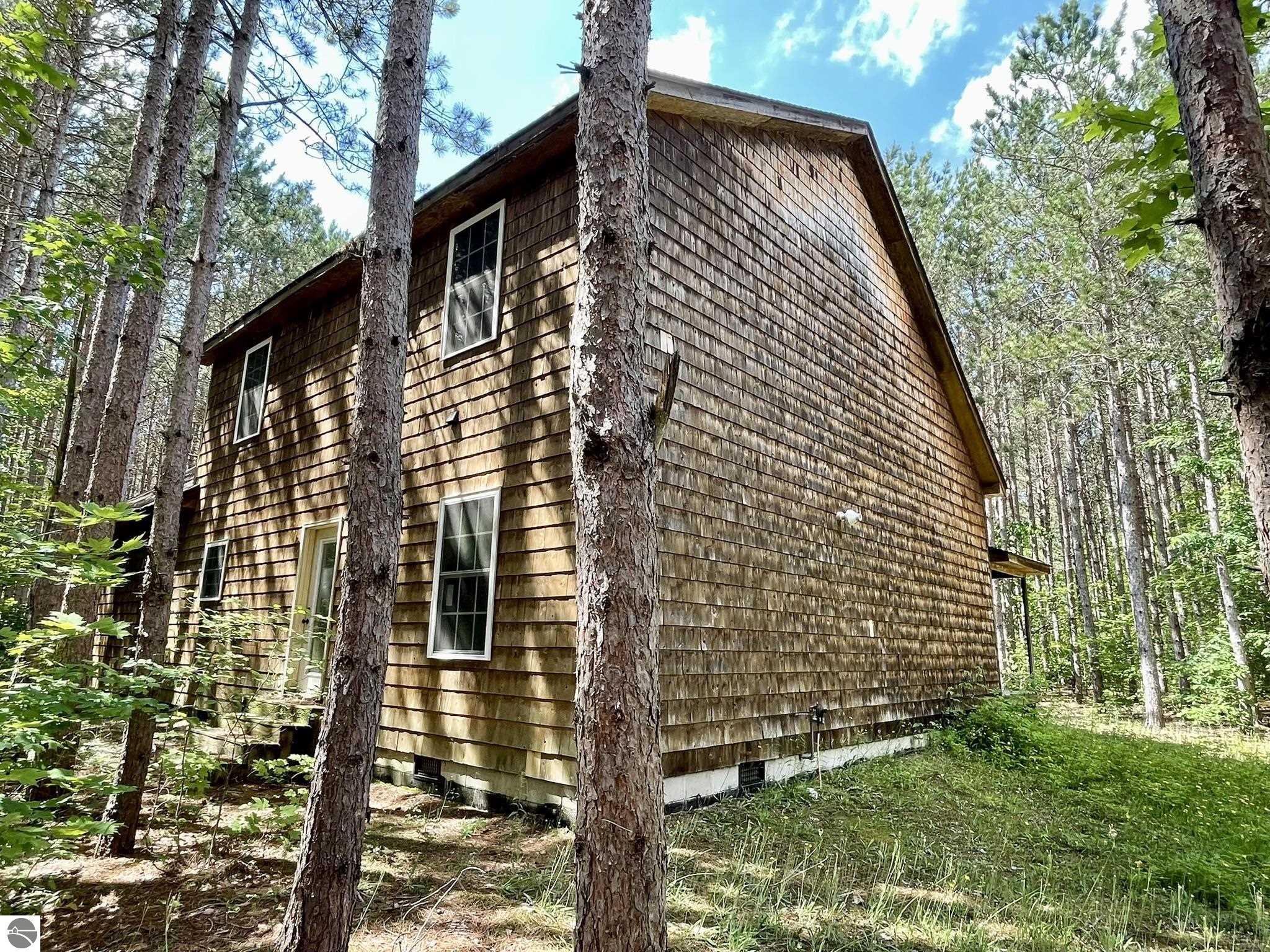 Nestled in 5 acres of pines is a private setting for this well constructed home needing to be finished. Construction started in 2007 with quality Materials such as tongue and grove pine on walls and ceilings. Oil-rubbed bronze light fixtures, faucets, door hands and ceiling fans. Kitchen and bathrooms feature custom made Amish cabinets and slate tile floors. Main level is living room with Antique wood burning pot belly stove, kitchen and dining, bedroom and full bath. This level is finished except for living room and bedroom flooring and some trim. Upper level has 3 BR and 2 bath with bonus room over the garage It has framing, insulation, most exterior walls tongue and groove wood, plumbing and wiring in place. Primary bath is finished. Some materials on site. Well & septic are in. Could live on site and finish it up. Has furnace & water heater. Attached garage is insulated and has washer and dryer. Selling as-is with furnishings. Great location near the Betsie River, Crystal Mountain for golf and skiing, Betsie Valley Bike trail, snowmobile trails and thousands of acres of state land and trails.