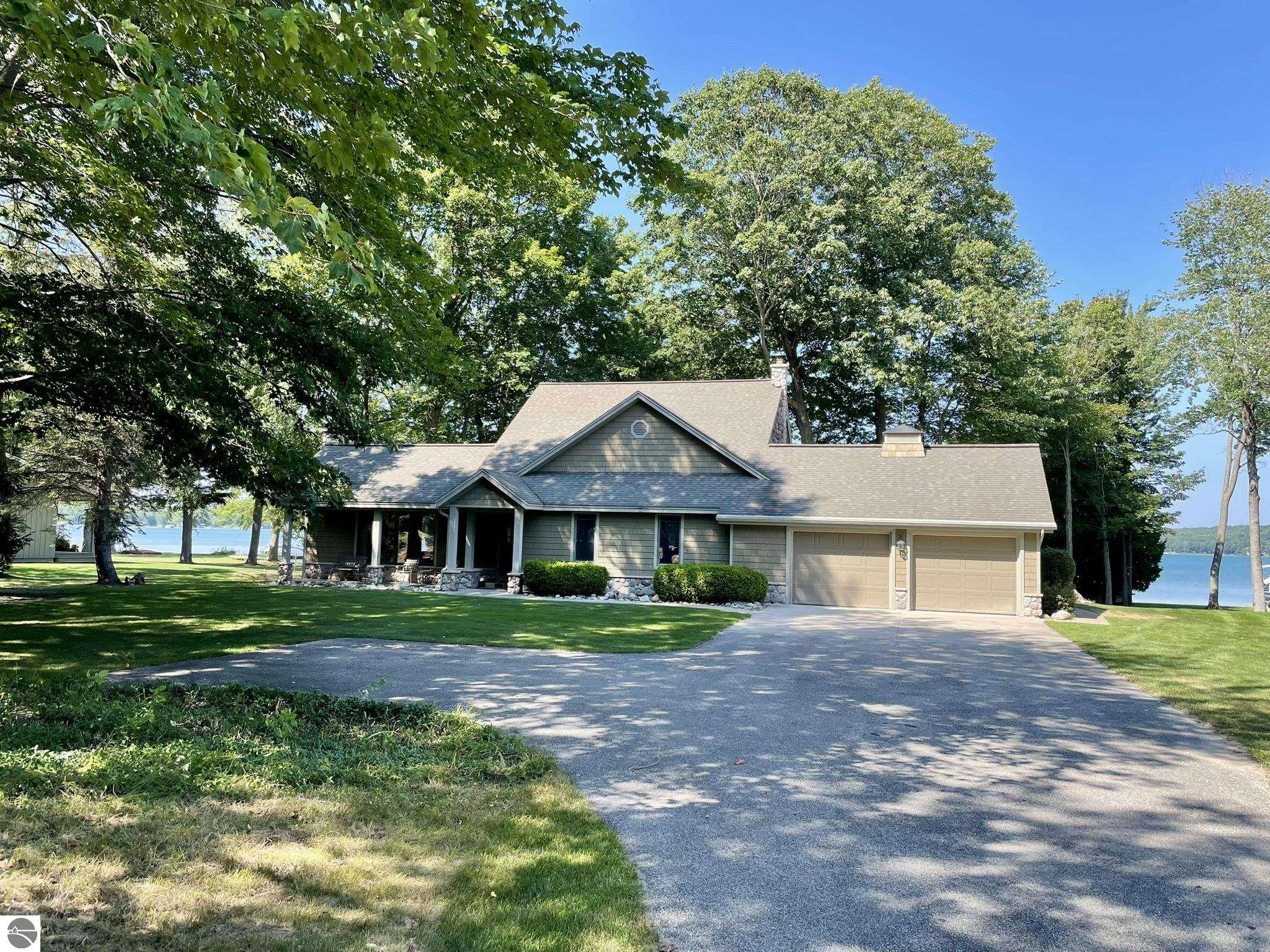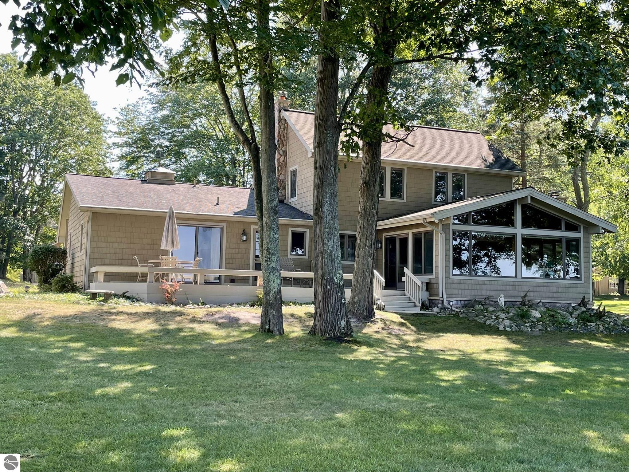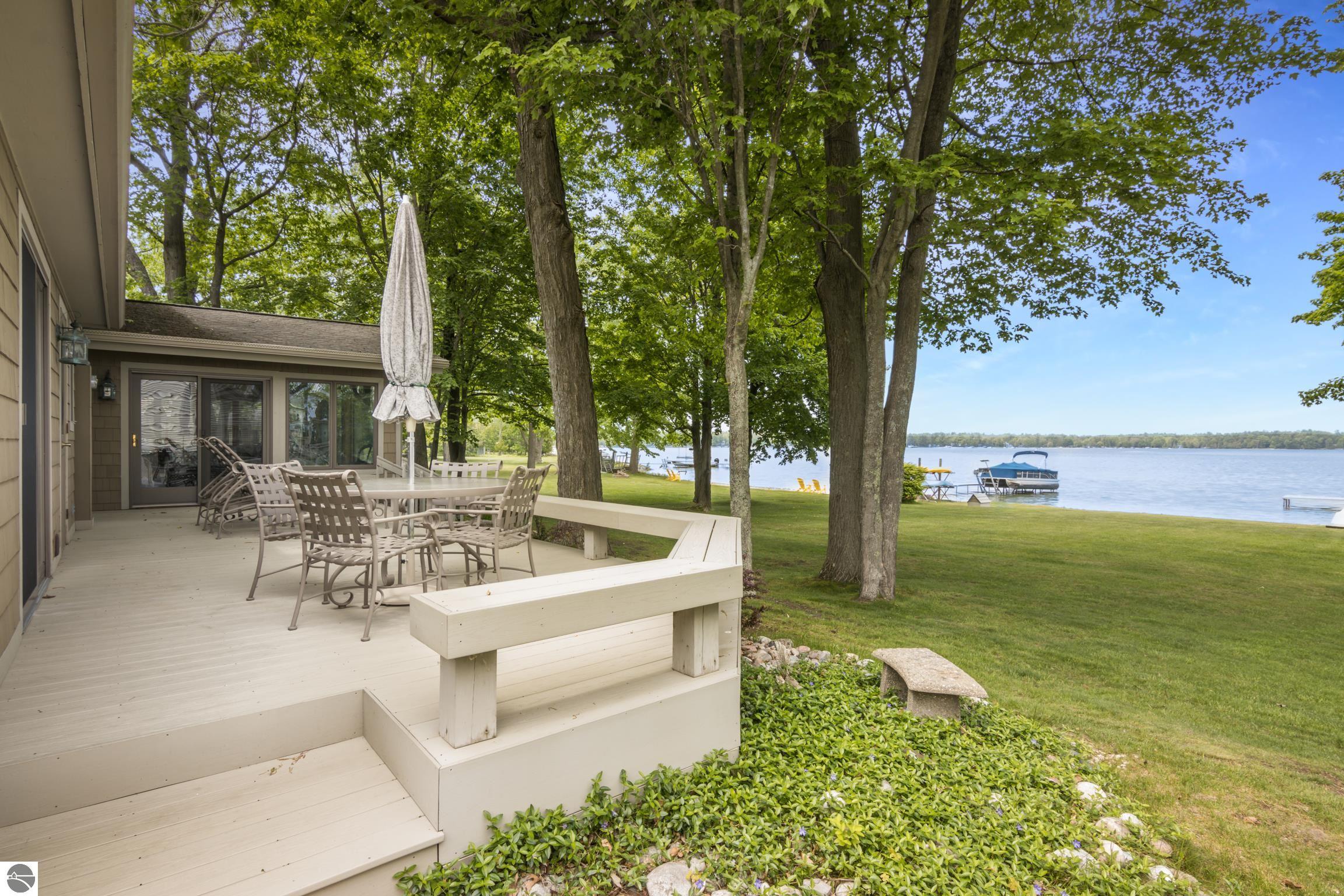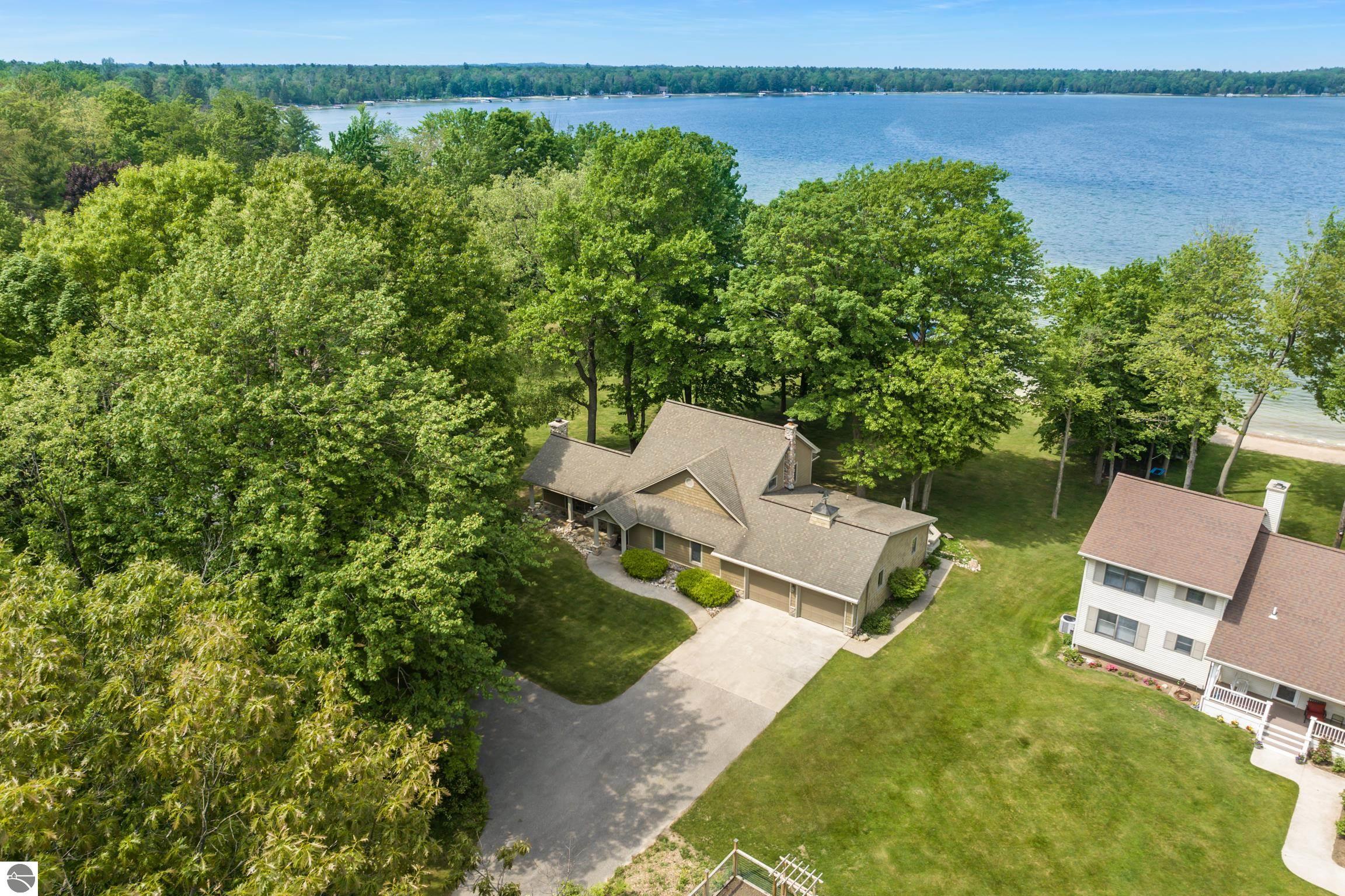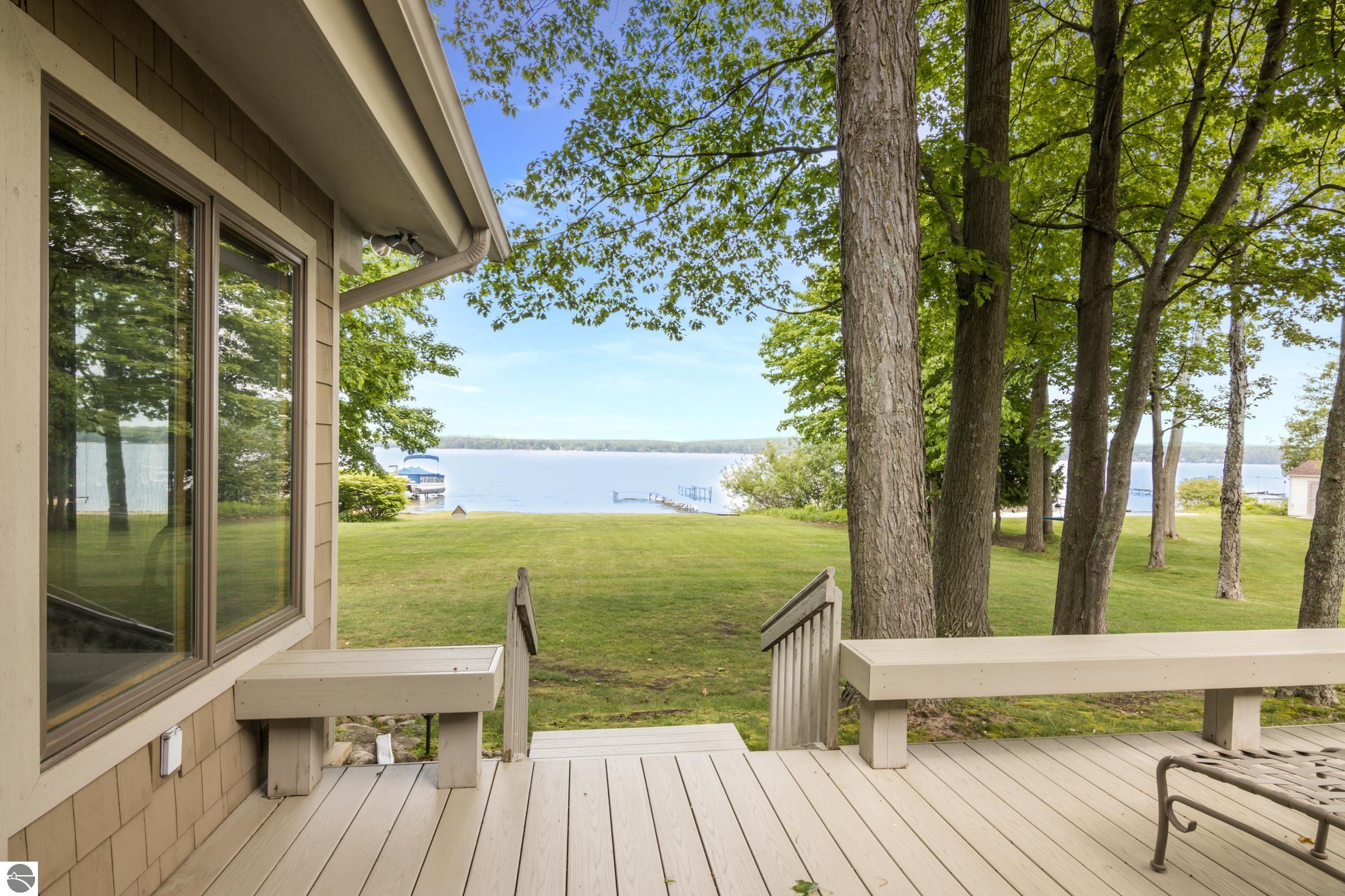 Invite guests to this attractive waterfront home on 1.7 acres with 100 feet of private, direct, sandy-bottom frontage and a dock on all-sports Big Platte Lake. Tucked away on Birch Point, near Sleeping Bear Dunes National Lakeshore property, this four-bedroom, two-bath, air-conditioned home offers an attached garage, a second 1200 sq. ft. garage, and one-quarter interest in an additional 6.3 acres to protect your privacy. The home’s interior features stunning views of the lake from most rooms, starting with Great Room’s soaring window views of the water accented by a wood vaulted ceiling and a sliding door to the deck. Overlooking this room, with its own views of the water, is the cook’s kitchen offering dual, built-in wall ovens, a Viking stainless gas stove with griddle, enormous counter space and lots of cupboards for cookware and pantry items. A tiled floor and backsplash provide easy kitchen clean-up. A cozy, living room, also with lake views, includes a wood-burning fireplace with a brick hearth and plenty of space for reading, watching TV or snuggling with pets. Also on the main level are two bedrooms. The primary bedroom has a private door to the shared bath with a tiled shower. The second bedroom has a slider to the lake-facing deck, and an entry to the mud/laundry room with washer-dryer, sink and cabinets. Upstairs are two more bedrooms, a full bath, and large storage space under the eaves. Amenities include cable TV/internet, natural gas forced-air and baseboard heating, and a lawn sprinkler system. The grassy, manicured yard includes tasteful landscaping and the back lawn leads to the sandy shore. Sit in a rocker on your covered front porch, or relax in a lounge chaise on the deck. It’s an easy, pretty drive to the hoppin’ city of Frankfort and villages of Honor and Beulah. Right around the corner, across M-22, are trails leading to Lake Michigan. Paddle from your private frontage on Big Platte Lake all the way to Lake Michigan.