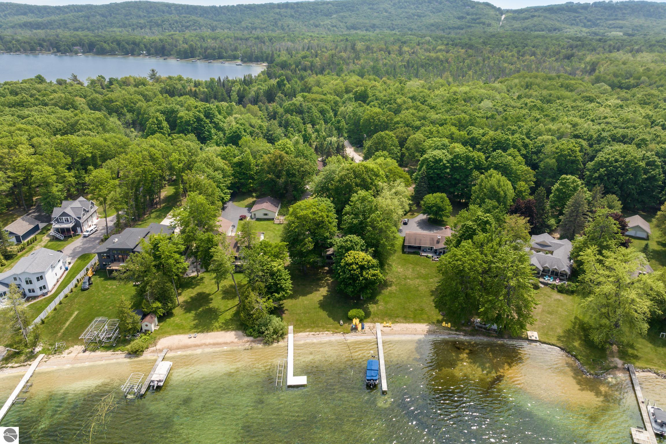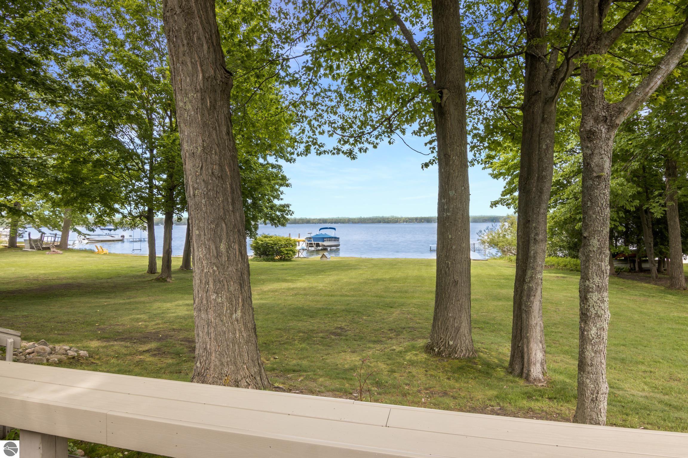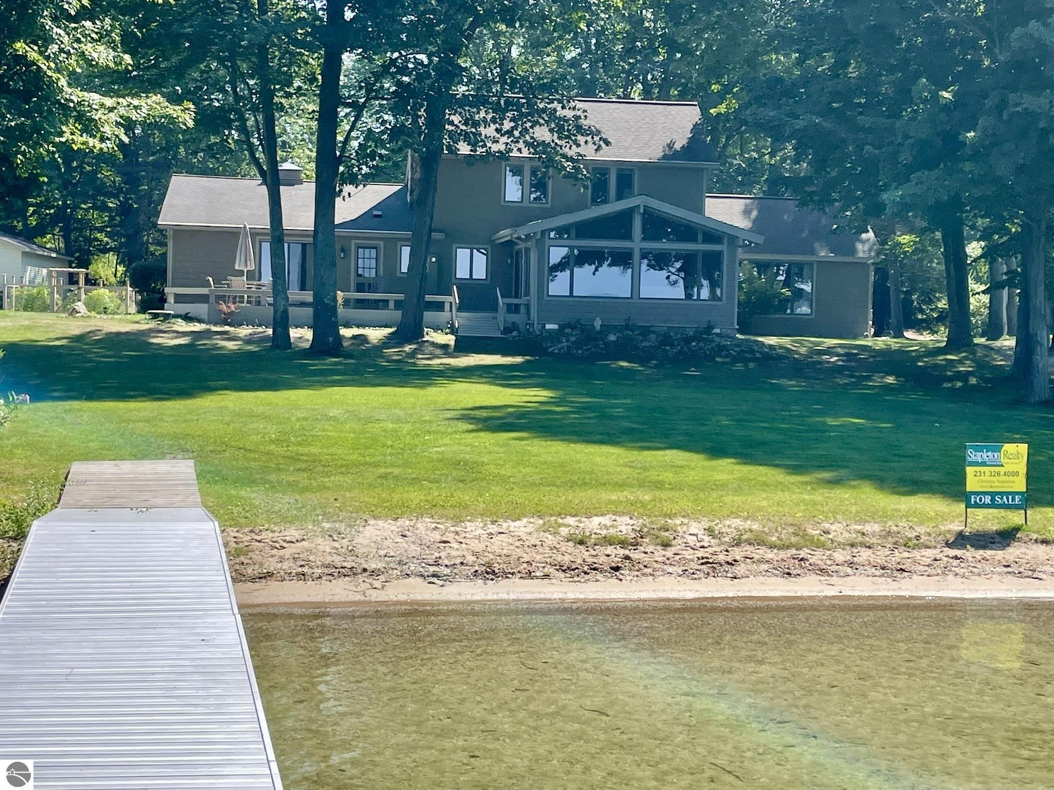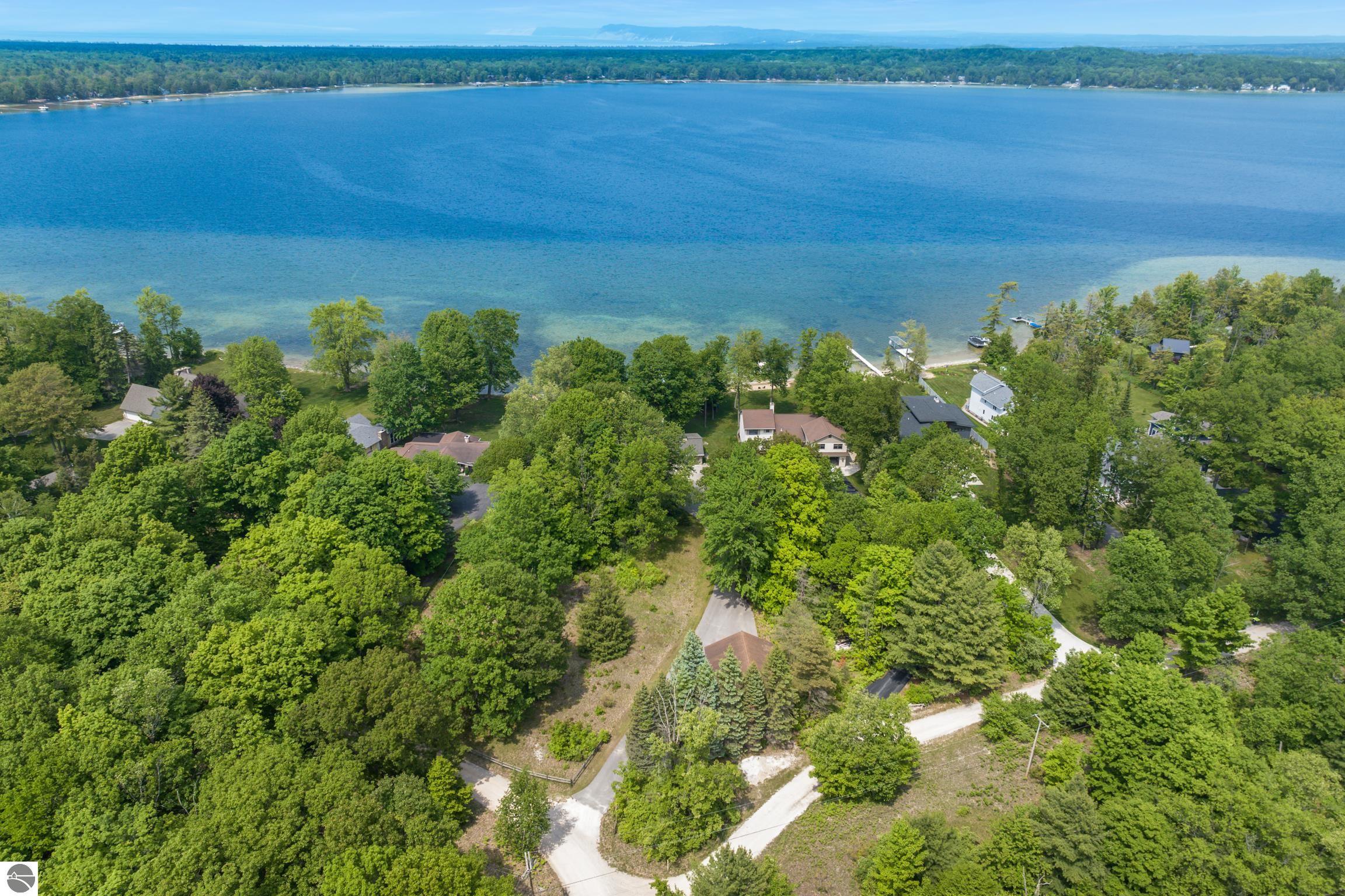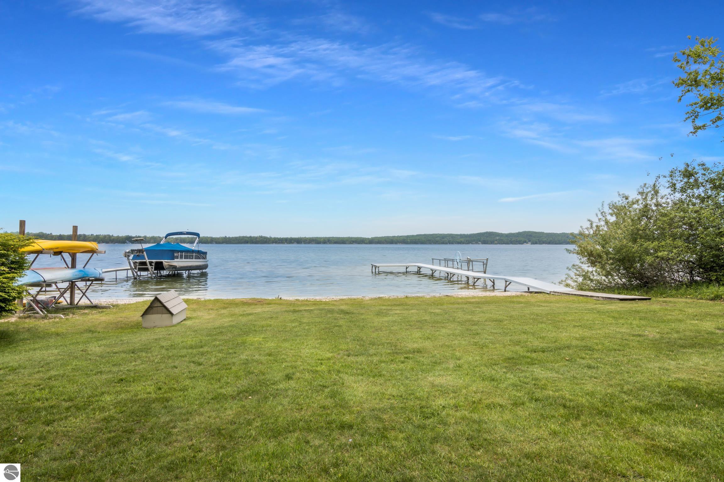 Invite guests to this attractive waterfront home on 1.7 acres with 100 feet of private, direct, sandy-bottom frontage and a dock on all-sports Big Platte Lake. Tucked away on Birch Point, near Sleeping Bear Dunes National Lakeshore property, this four-bedroom, two-bath, air-conditioned home offers an attached garage, a second 1200 sq. ft. garage, and one-quarter interest in an additional 6.3 acres to protect your privacy. The home’s interior features stunning views of the lake from most rooms, starting with Great Room’s soaring window views of the water accented by a wood vaulted ceiling and a sliding door to the deck. Overlooking this room, with its own views of the water, is the cook’s kitchen offering dual, built-in wall ovens, a Viking stainless gas stove with griddle, enormous counter space and lots of cupboards for cookware and pantry items. A tiled floor and backsplash provide easy kitchen clean-up. A cozy, living room, also with lake views, includes a wood-burning fireplace with a brick hearth and plenty of space for reading, watching TV or snuggling with pets. Also on the main level are two bedrooms. The primary bedroom has a private door to the shared bath with a tiled shower. The second bedroom has a slider to the lake-facing deck, and an entry to the mud/laundry room with washer-dryer, sink and cabinets. Upstairs are two more bedrooms, a full bath, and large storage space under the eaves. Amenities include cable TV/internet, natural gas forced-air and baseboard heating, and a lawn sprinkler system. The grassy, manicured yard includes tasteful landscaping and the back lawn leads to the sandy shore. Sit in a rocker on your covered front porch, or relax in a lounge chaise on the deck. It’s an easy, pretty drive to the hoppin’ city of Frankfort and villages of Honor and Beulah. Right around the corner, across M-22, are trails leading to Lake Michigan. Paddle from your private frontage on Big Platte Lake all the way to Lake Michigan.