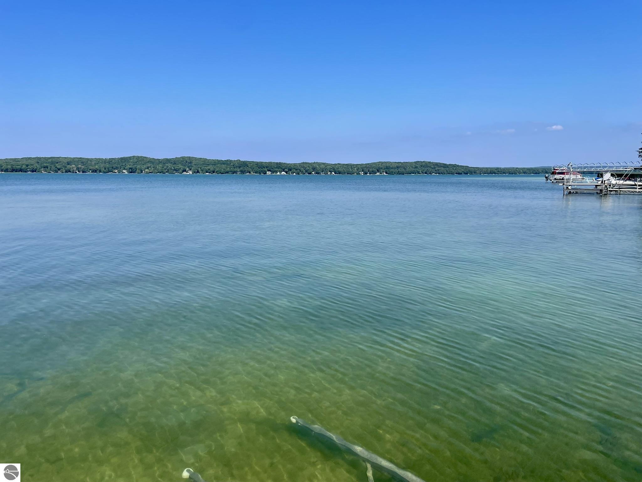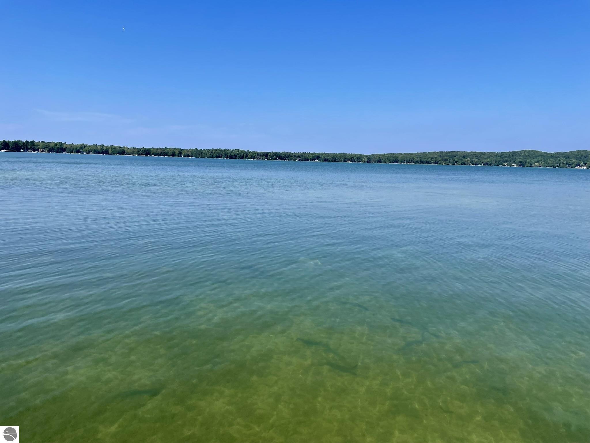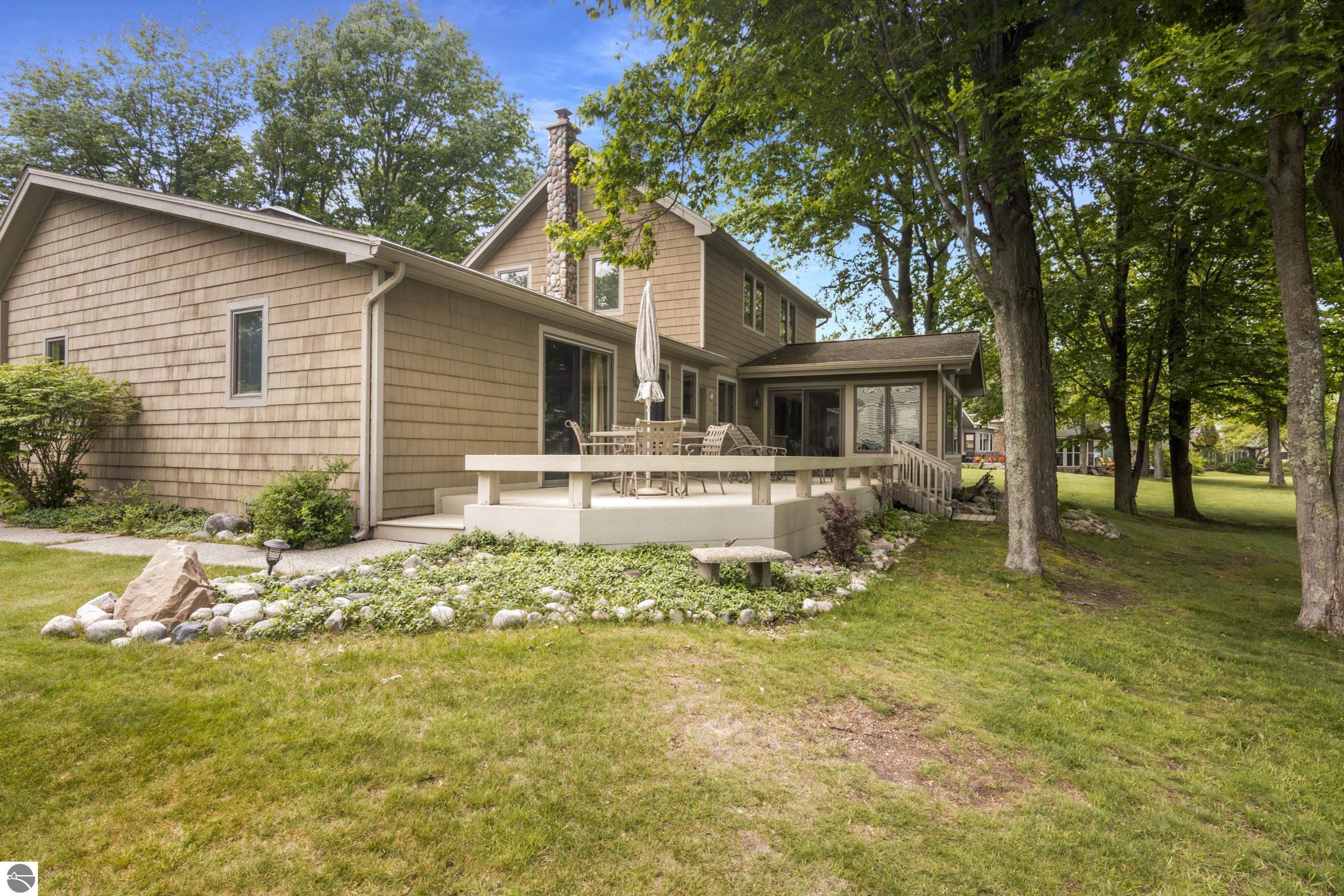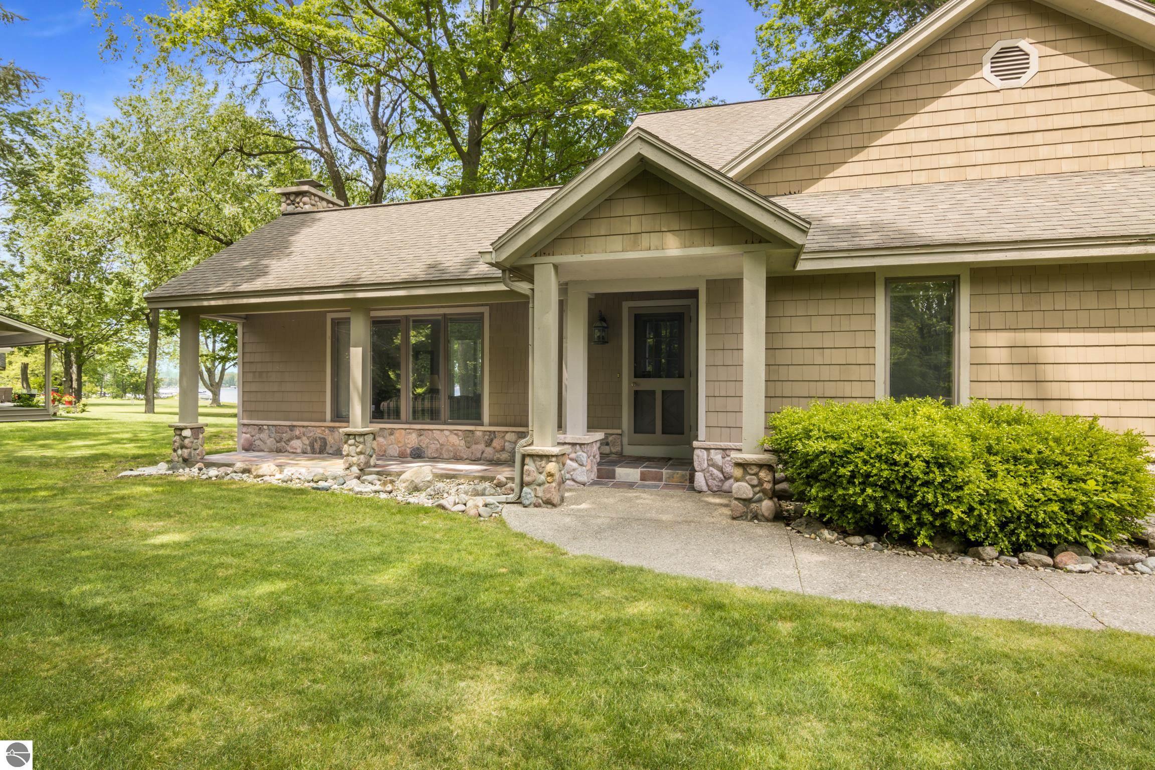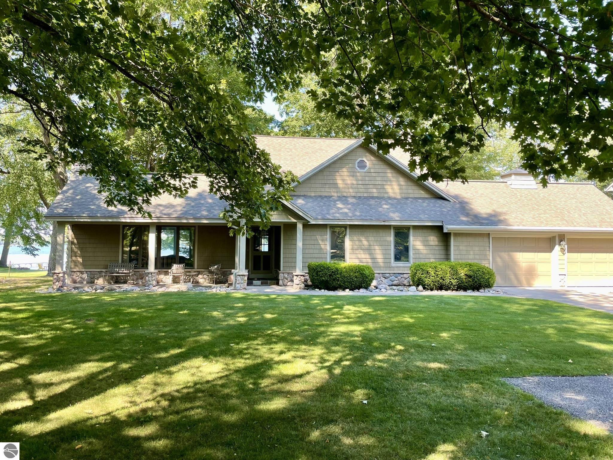 Invite guests to this attractive waterfront home on 1.7 acres with 100 feet of private, direct, sandy-bottom frontage and a dock on all-sports Big Platte Lake. Tucked away on Birch Point, near Sleeping Bear Dunes National Lakeshore property, this four-bedroom, two-bath, air-conditioned home offers an attached garage, a second 1200 sq. ft. garage, and one-quarter interest in an additional 6.3 acres to protect your privacy. The home’s interior features stunning views of the lake from most rooms, starting with Great Room’s soaring window views of the water accented by a wood vaulted ceiling and a sliding door to the deck. Overlooking this room, with its own views of the water, is the cook’s kitchen offering dual, built-in wall ovens, a Viking stainless gas stove with griddle, enormous counter space and lots of cupboards for cookware and pantry items. A tiled floor and backsplash provide easy kitchen clean-up. A cozy, living room, also with lake views, includes a wood-burning fireplace with a brick hearth and plenty of space for reading, watching TV or snuggling with pets. Also on the main level are two bedrooms. The primary bedroom has a private door to the shared bath with a tiled shower. The second bedroom has a slider to the lake-facing deck, and an entry to the mud/laundry room with washer-dryer, sink and cabinets. Upstairs are two more bedrooms, a full bath, and large storage space under the eaves. Amenities include cable TV/internet, natural gas forced-air and baseboard heating, and a lawn sprinkler system. The grassy, manicured yard includes tasteful landscaping and the back lawn leads to the sandy shore. Sit in a rocker on your covered front porch, or relax in a lounge chaise on the deck. It’s an easy, pretty drive to the hoppin’ city of Frankfort and villages of Honor and Beulah. Right around the corner, across M-22, are trails leading to Lake Michigan. Paddle from your private frontage on Big Platte Lake all the way to Lake Michigan.