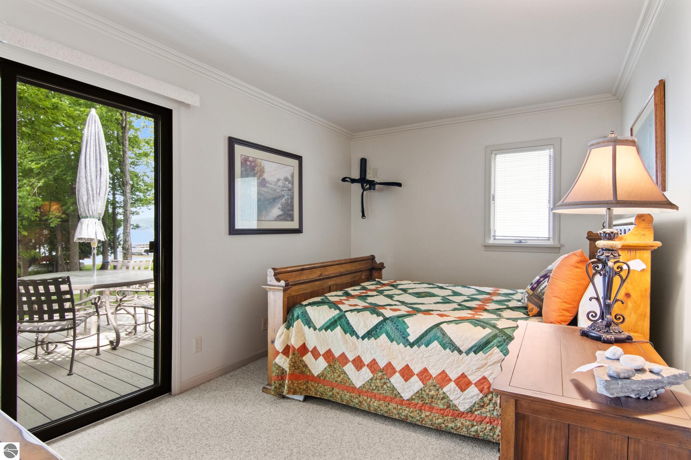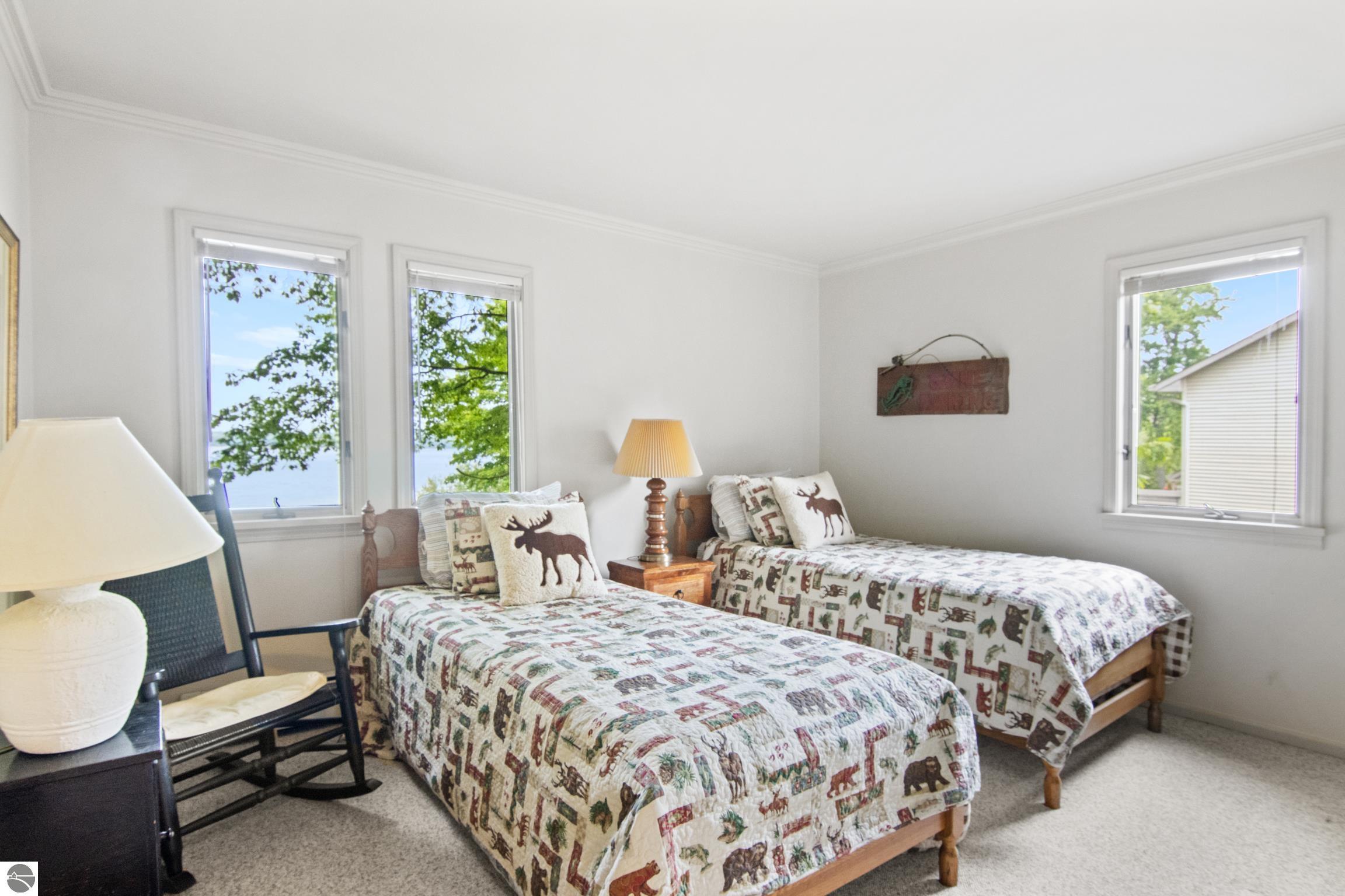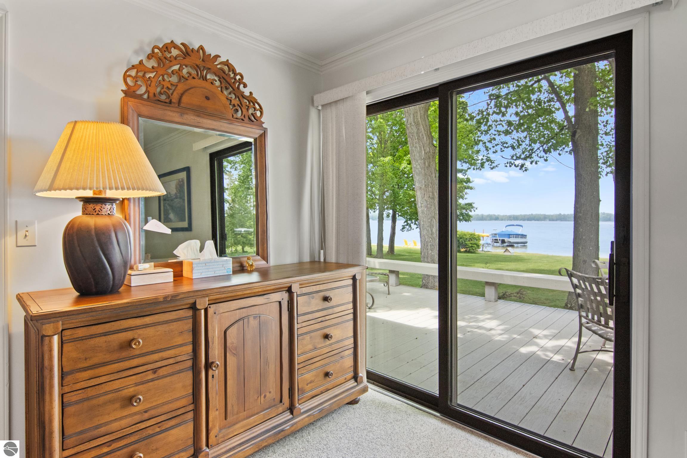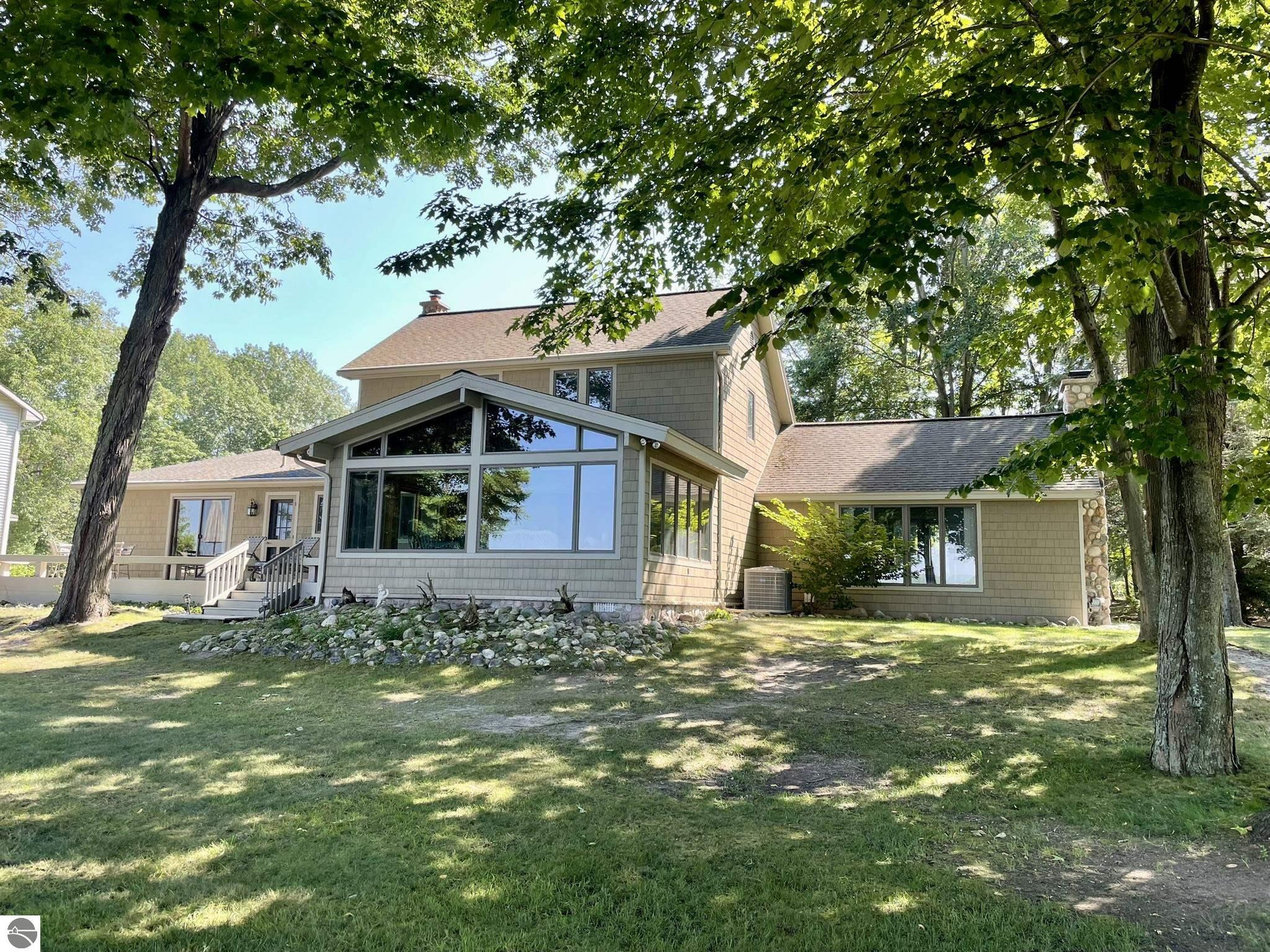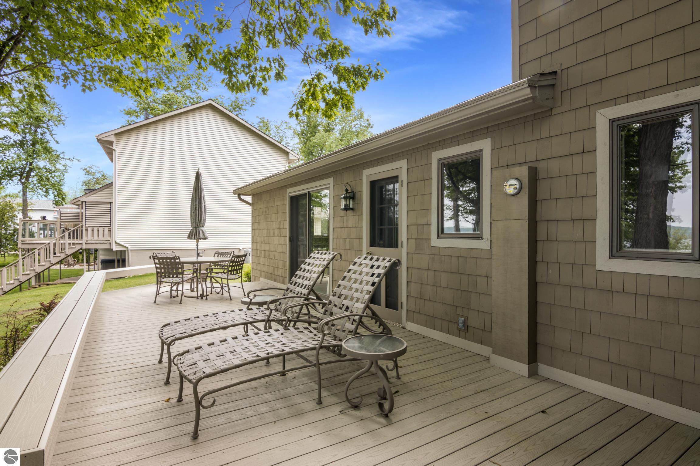 Invite guests to this attractive waterfront home on 1.7 acres with 100 feet of private, direct, sandy-bottom frontage and a dock on all-sports Big Platte Lake. Tucked away on Birch Point, near Sleeping Bear Dunes National Lakeshore property, this four-bedroom, two-bath, air-conditioned home offers an attached garage, a second 1200 sq. ft. garage, and one-quarter interest in an additional 6.3 acres to protect your privacy. The home’s interior features stunning views of the lake from most rooms, starting with Great Room’s soaring window views of the water accented by a wood vaulted ceiling and a sliding door to the deck. Overlooking this room, with its own views of the water, is the cook’s kitchen offering dual, built-in wall ovens, a Viking stainless gas stove with griddle, enormous counter space and lots of cupboards for cookware and pantry items. A tiled floor and backsplash provide easy kitchen clean-up. A cozy, living room, also with lake views, includes a wood-burning fireplace with a brick hearth and plenty of space for reading, watching TV or snuggling with pets. Also on the main level are two bedrooms. The primary bedroom has a private door to the shared bath with a tiled shower. The second bedroom has a slider to the lake-facing deck, and an entry to the mud/laundry room with washer-dryer, sink and cabinets. Upstairs are two more bedrooms, a full bath, and large storage space under the eaves. Amenities include cable TV/internet, natural gas forced-air and baseboard heating, and a lawn sprinkler system. The grassy, manicured yard includes tasteful landscaping and the back lawn leads to the sandy shore. Sit in a rocker on your covered front porch, or relax in a lounge chaise on the deck. It’s an easy, pretty drive to the hoppin’ city of Frankfort and villages of Honor and Beulah. Right around the corner, across M-22, are trails leading to Lake Michigan. Paddle from your private frontage on Big Platte Lake all the way to Lake Michigan.