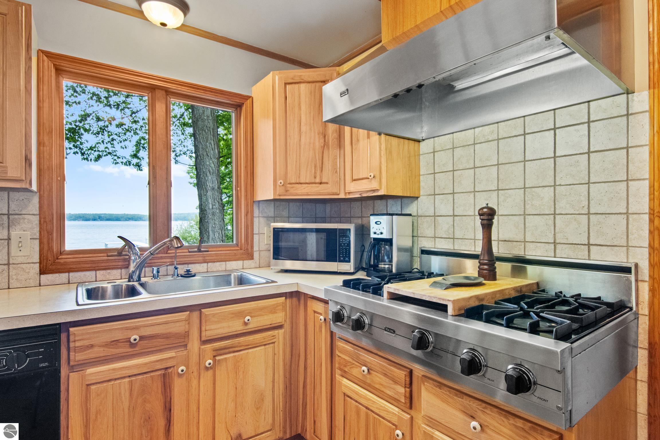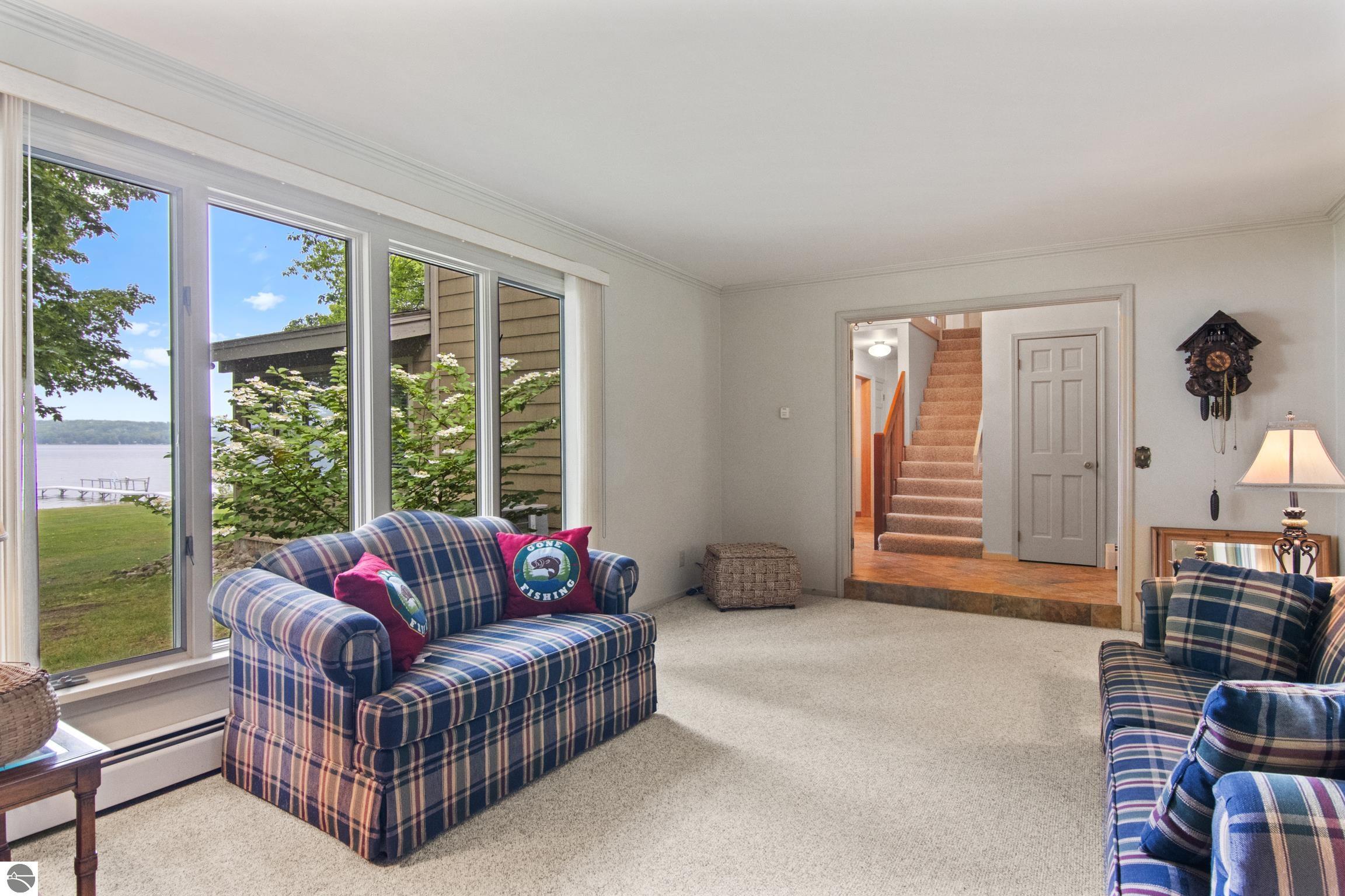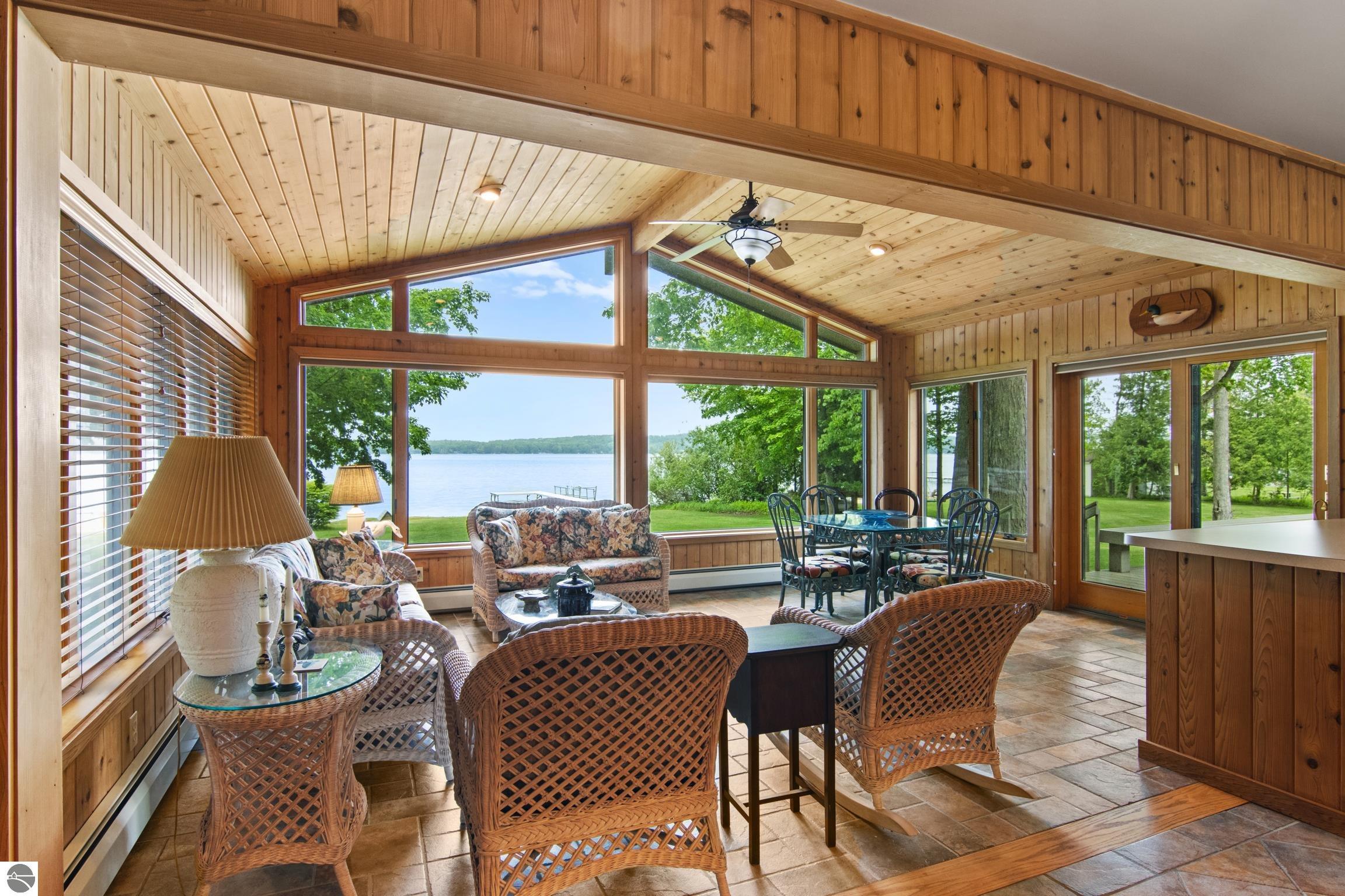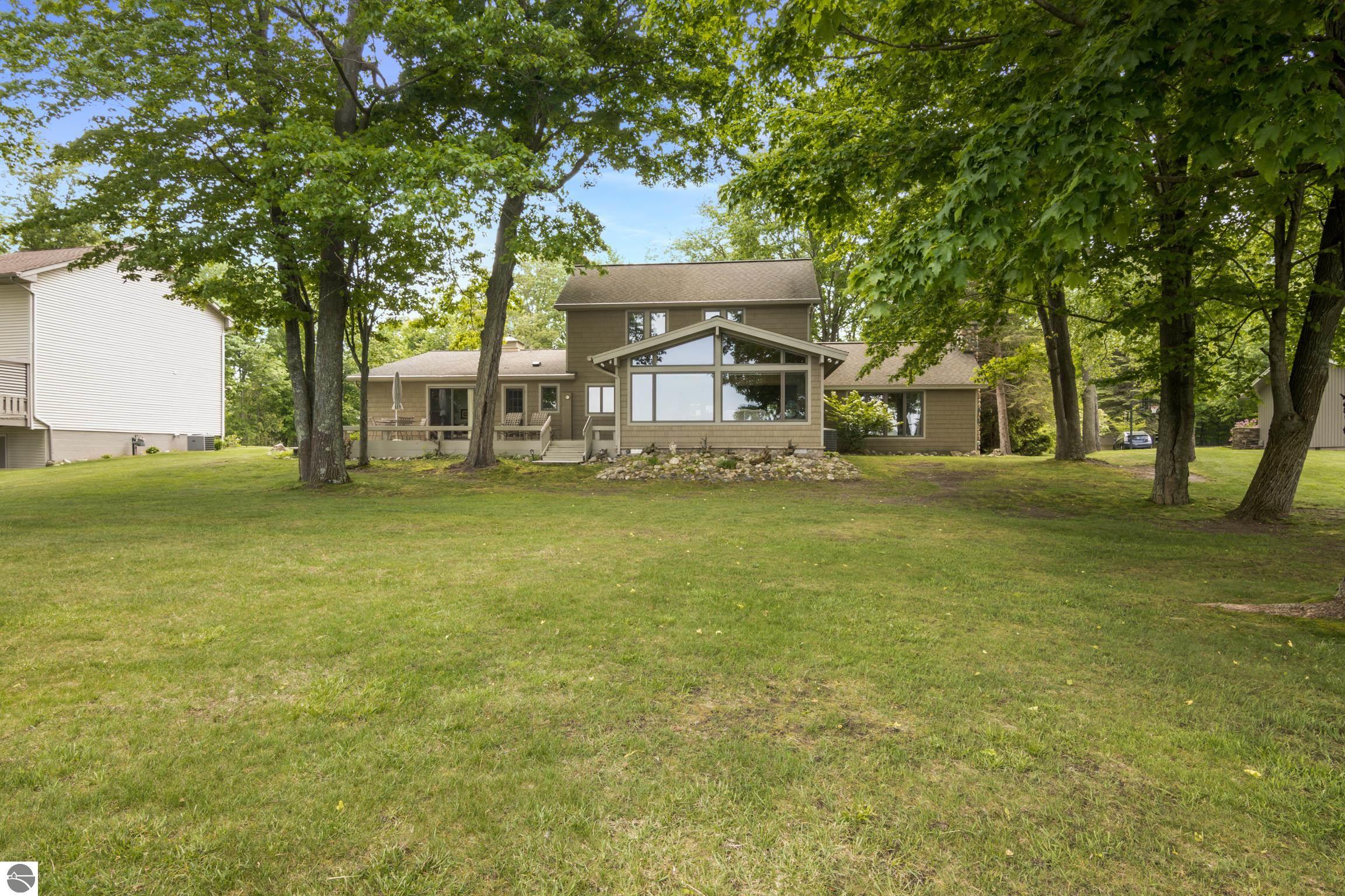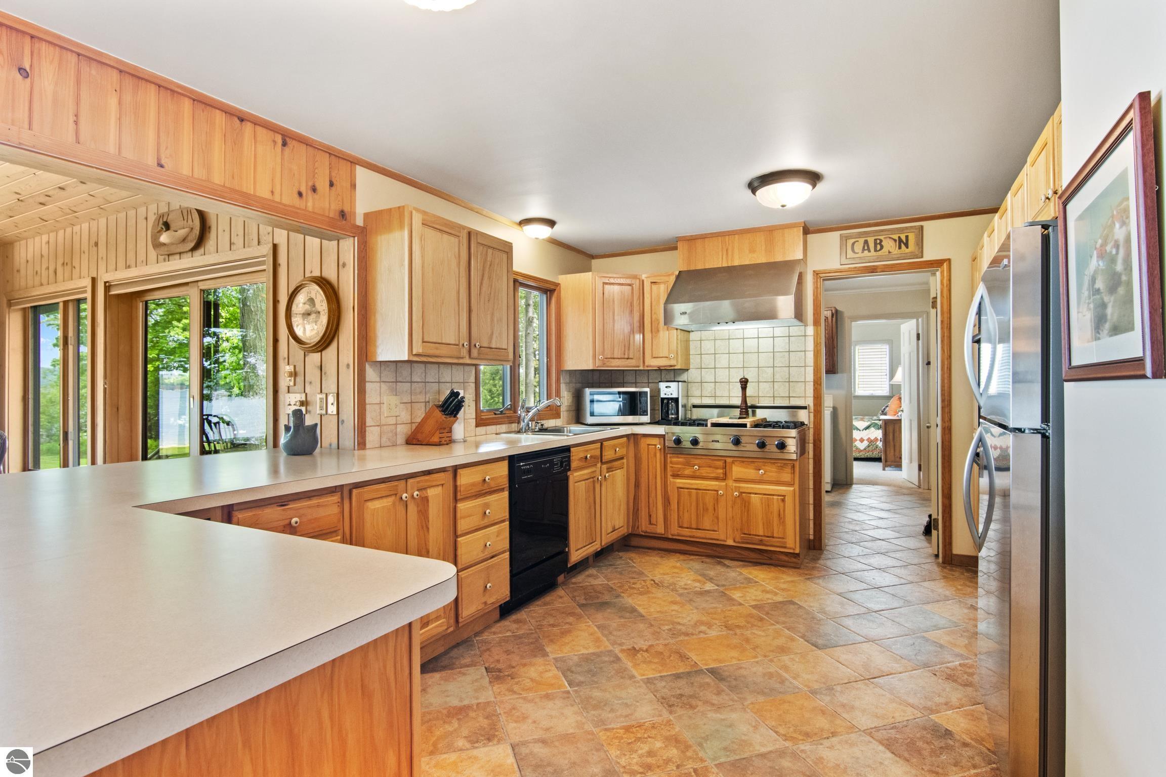 Invite guests to this attractive waterfront home on 1.7 acres with 100 feet of private, direct, sandy-bottom frontage and a dock on all-sports Big Platte Lake. Tucked away on Birch Point, near Sleeping Bear Dunes National Lakeshore property, this four-bedroom, two-bath, air-conditioned home offers an attached garage, a second 1200 sq. ft. garage, and one-quarter interest in an additional 6.3 acres to protect your privacy. The home’s interior features stunning views of the lake from most rooms, starting with Great Room’s soaring window views of the water accented by a wood vaulted ceiling and a sliding door to the deck. Overlooking this room, with its own views of the water, is the cook’s kitchen offering dual, built-in wall ovens, a Viking stainless gas stove with griddle, enormous counter space and lots of cupboards for cookware and pantry items. A tiled floor and backsplash provide easy kitchen clean-up. A cozy, living room, also with lake views, includes a wood-burning fireplace with a brick hearth and plenty of space for reading, watching TV or snuggling with pets. Also on the main level are two bedrooms. The primary bedroom has a private door to the shared bath with a tiled shower. The second bedroom has a slider to the lake-facing deck, and an entry to the mud/laundry room with washer-dryer, sink and cabinets. Upstairs are two more bedrooms, a full bath, and large storage space under the eaves. Amenities include cable TV/internet, natural gas forced-air and baseboard heating, and a lawn sprinkler system. The grassy, manicured yard includes tasteful landscaping and the back lawn leads to the sandy shore. Sit in a rocker on your covered front porch, or relax in a lounge chaise on the deck. It’s an easy, pretty drive to the hoppin’ city of Frankfort and villages of Honor and Beulah. Right around the corner, across M-22, are trails leading to Lake Michigan. Paddle from your private frontage on Big Platte Lake all the way to Lake Michigan.