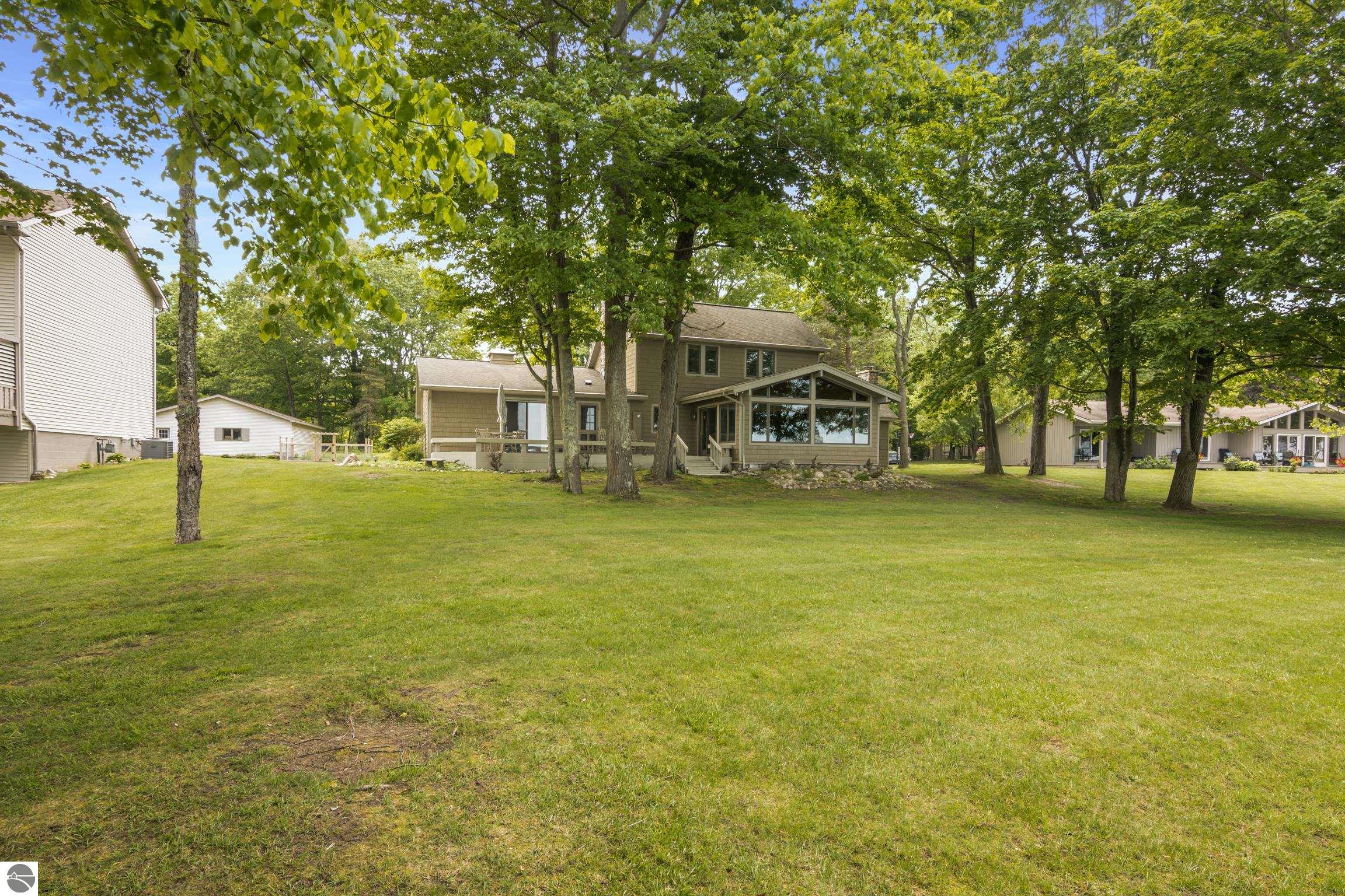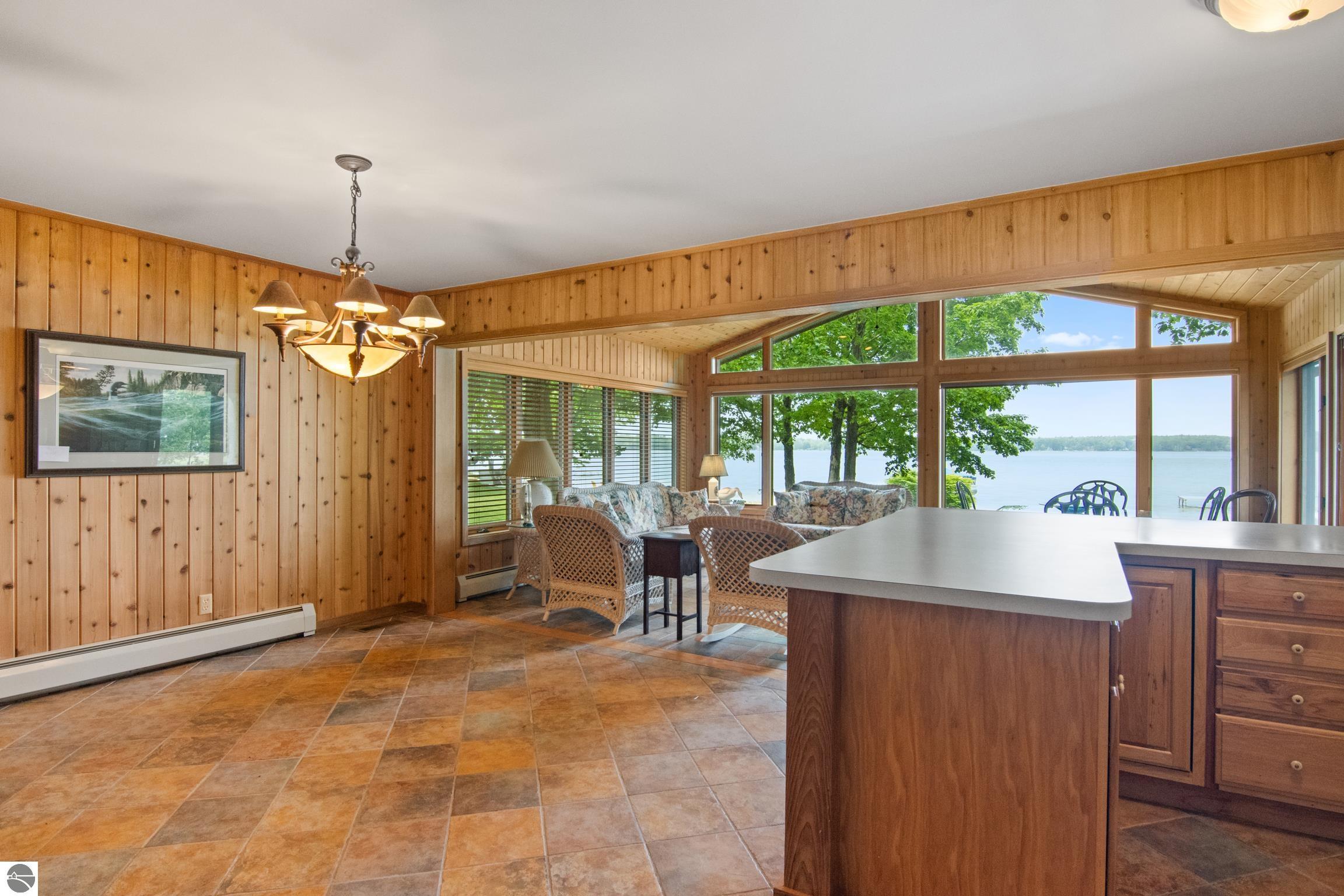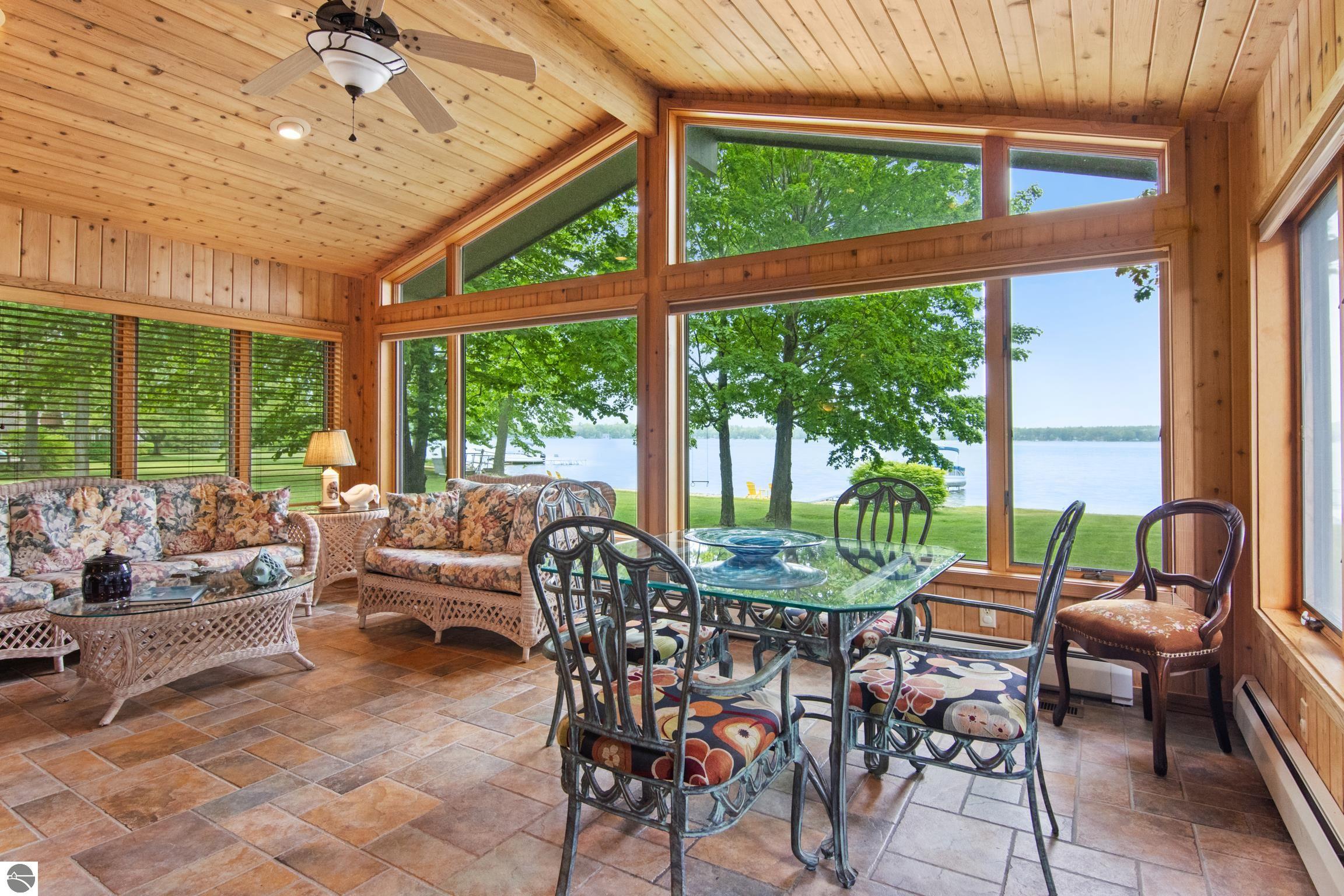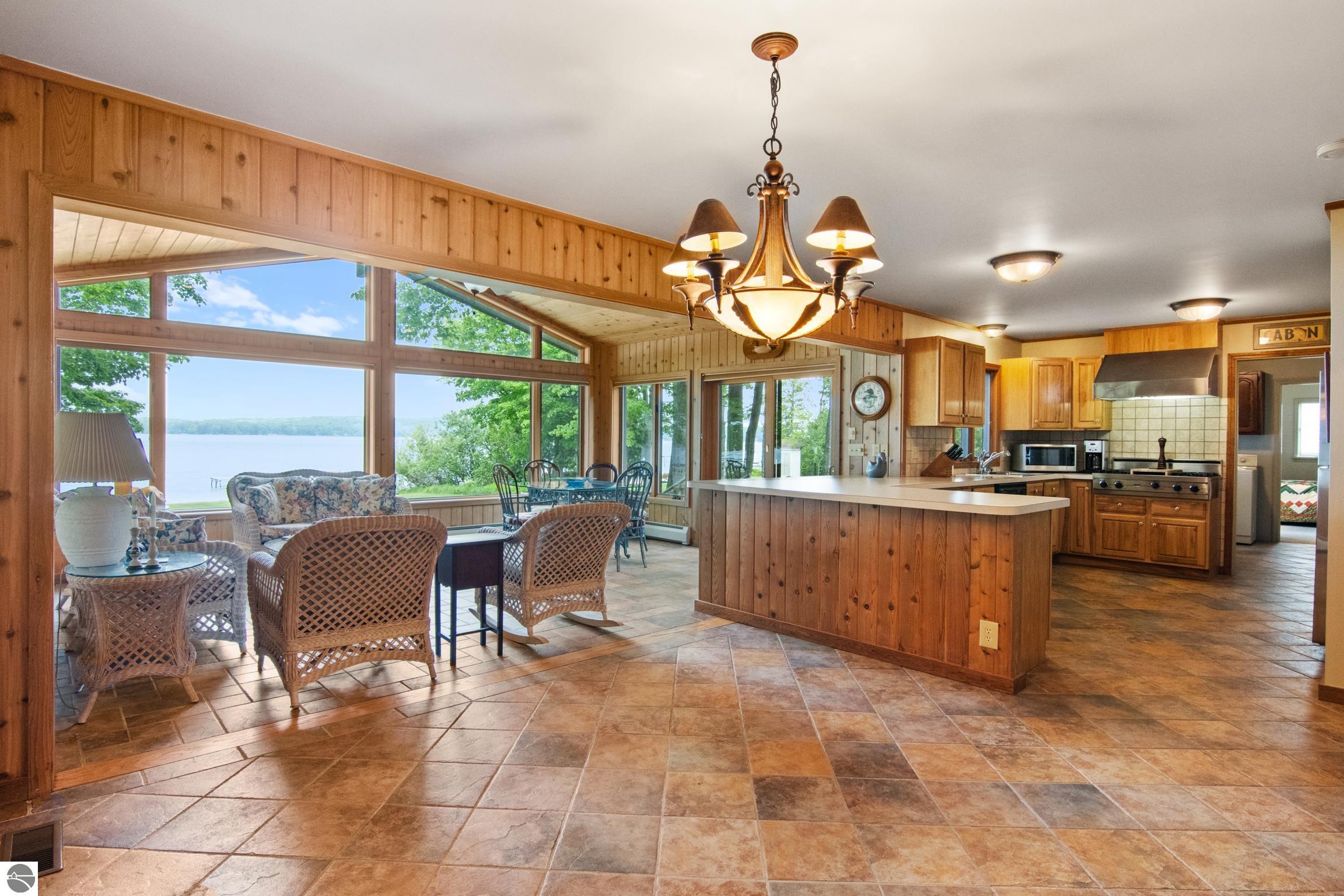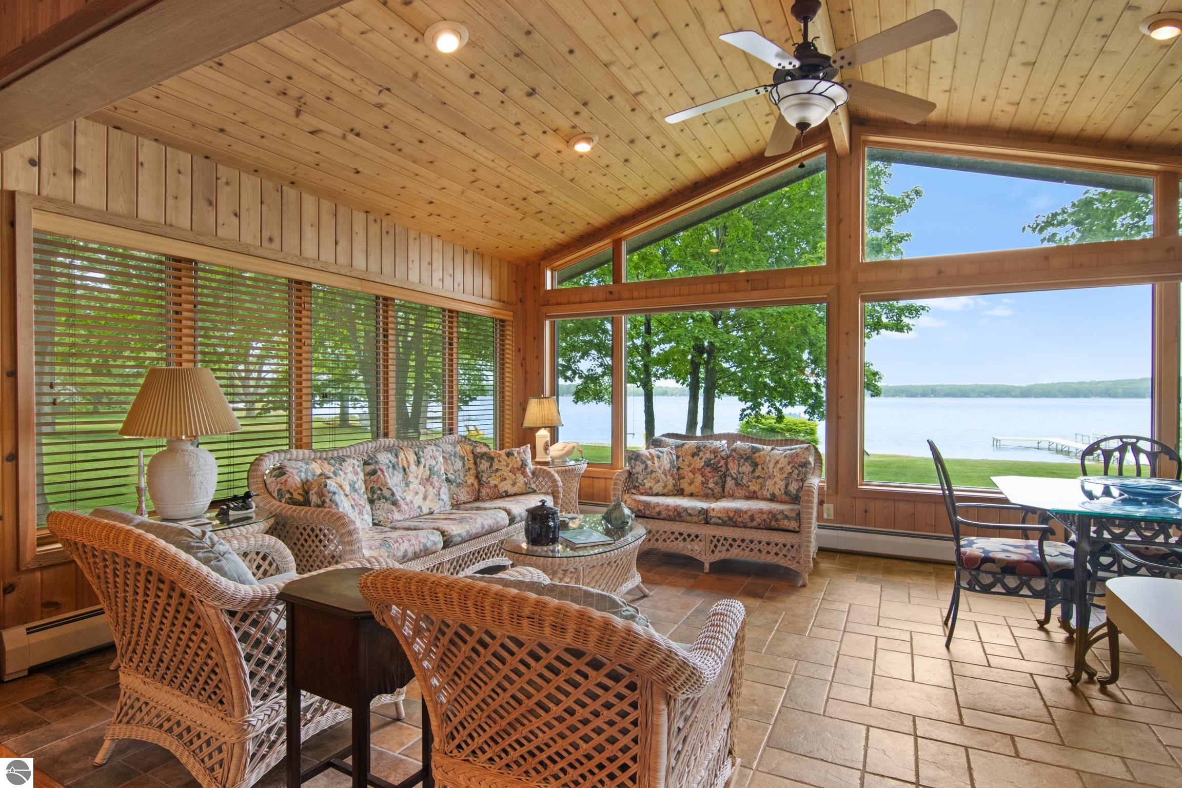Invite guests to this attractive waterfront home on 1.7 acres with 100 feet of private, direct, sandy-bottom frontage and a dock on all-sports Big Platte Lake. Tucked away on Birch Point, near Sleeping Bear Dunes National Lakeshore property, this four-bedroom, two-bath, air-conditioned home offers an attached garage, a second 1200 sq. ft. garage, and one-quarter interest in an additional 6.3 acres to protect your privacy. The home’s interior features stunning views of the lake from most rooms, starting with Great Room’s soaring window views of the water accented by a wood vaulted ceiling and a sliding door to the deck. Overlooking this room, with its own views of the water, is the cook’s kitchen offering dual, built-in wall ovens, a Viking stainless gas stove with griddle, enormous counter space and lots of cupboards for cookware and pantry items. A tiled floor and backsplash provide easy kitchen clean-up. A cozy, living room, also with lake views, includes a wood-burning fireplace with a brick hearth and plenty of space for reading, watching TV or snuggling with pets. Also on the main level are two bedrooms. The primary bedroom has a private door to the shared bath with a tiled shower. The second bedroom has a slider to the lake-facing deck, and an entry to the mud/laundry room with washer-dryer, sink and cabinets. Upstairs are two more bedrooms, a full bath, and large storage space under the eaves. Amenities include cable TV/internet, natural gas forced-air and baseboard heating, and a lawn sprinkler system. The grassy, manicured yard includes tasteful landscaping and the back lawn leads to the sandy shore. Sit in a rocker on your covered front porch, or relax in a lounge chaise on the deck. It’s an easy, pretty drive to the hoppin’ city of Frankfort and villages of Honor and Beulah. Right around the corner, across M-22, are trails leading to Lake Michigan. Paddle from your private frontage on Big Platte Lake all the way to Lake Michigan.