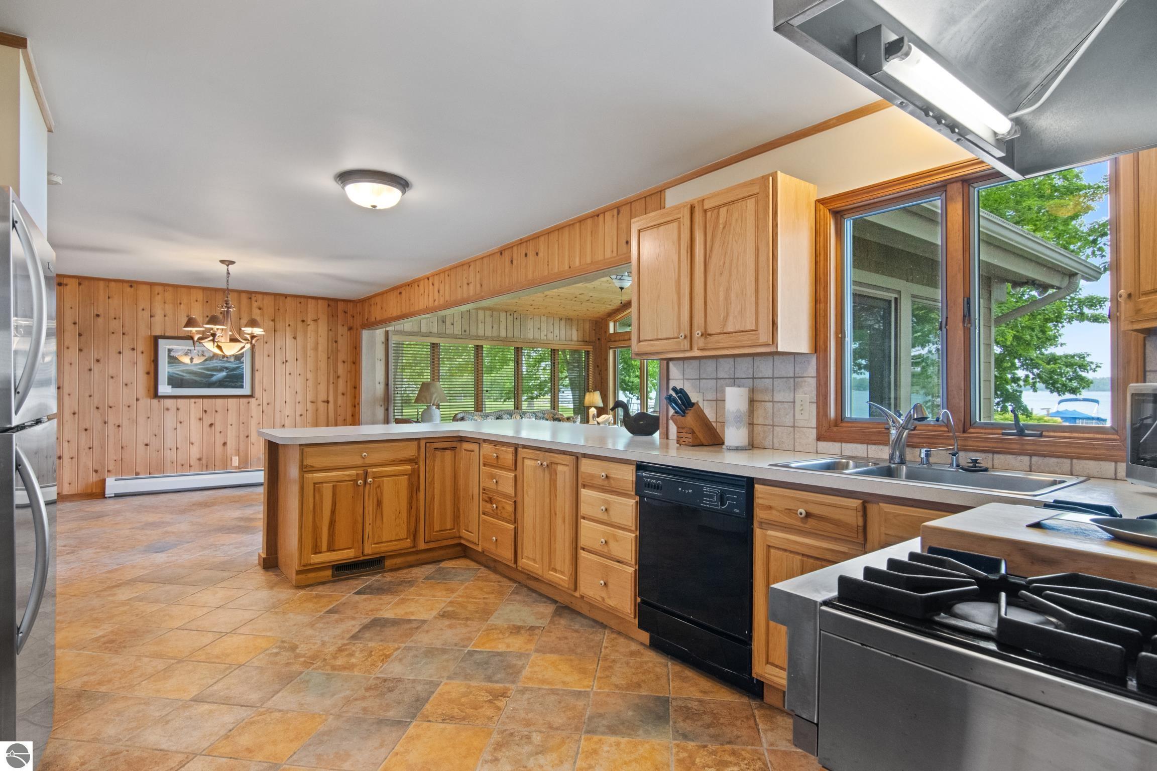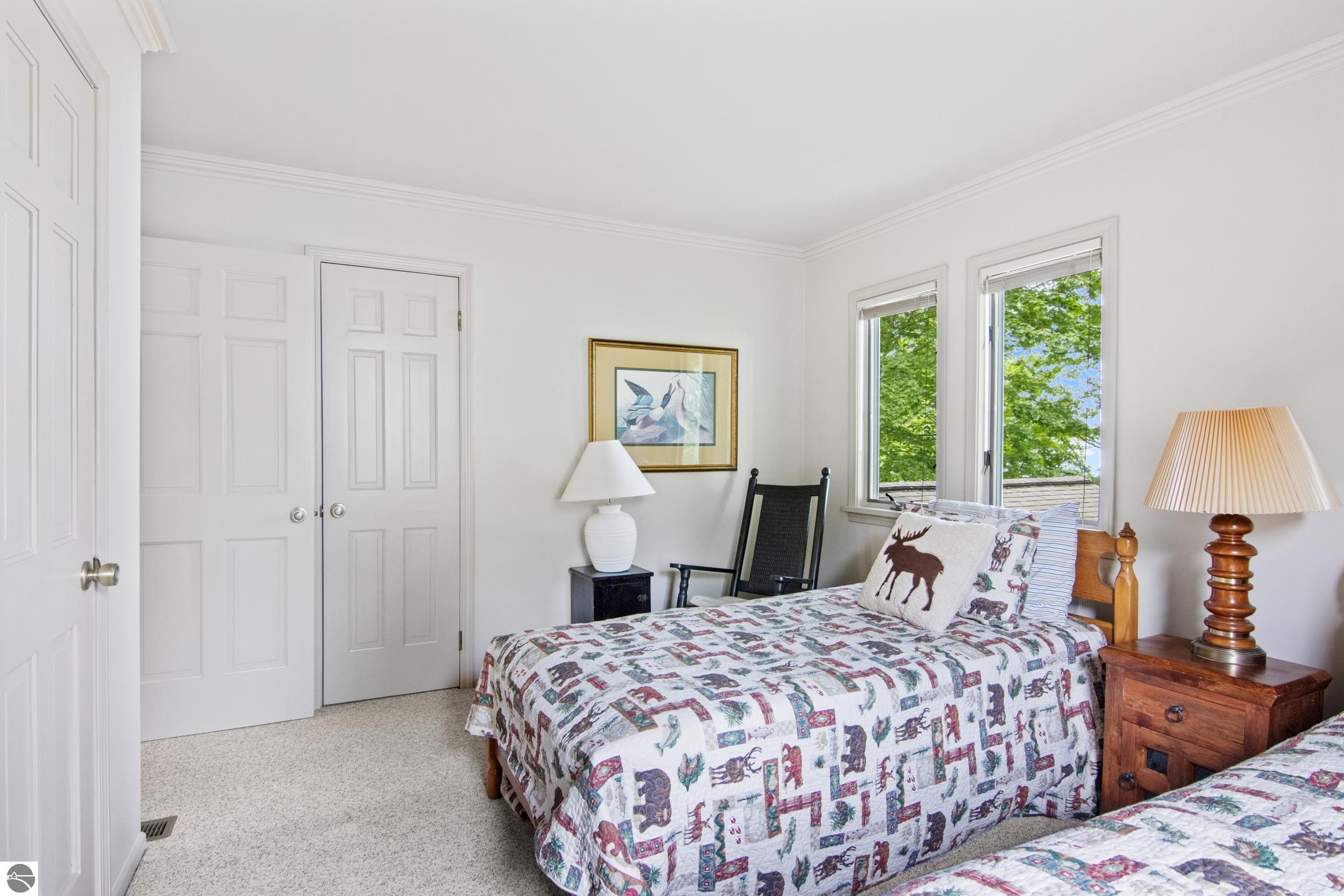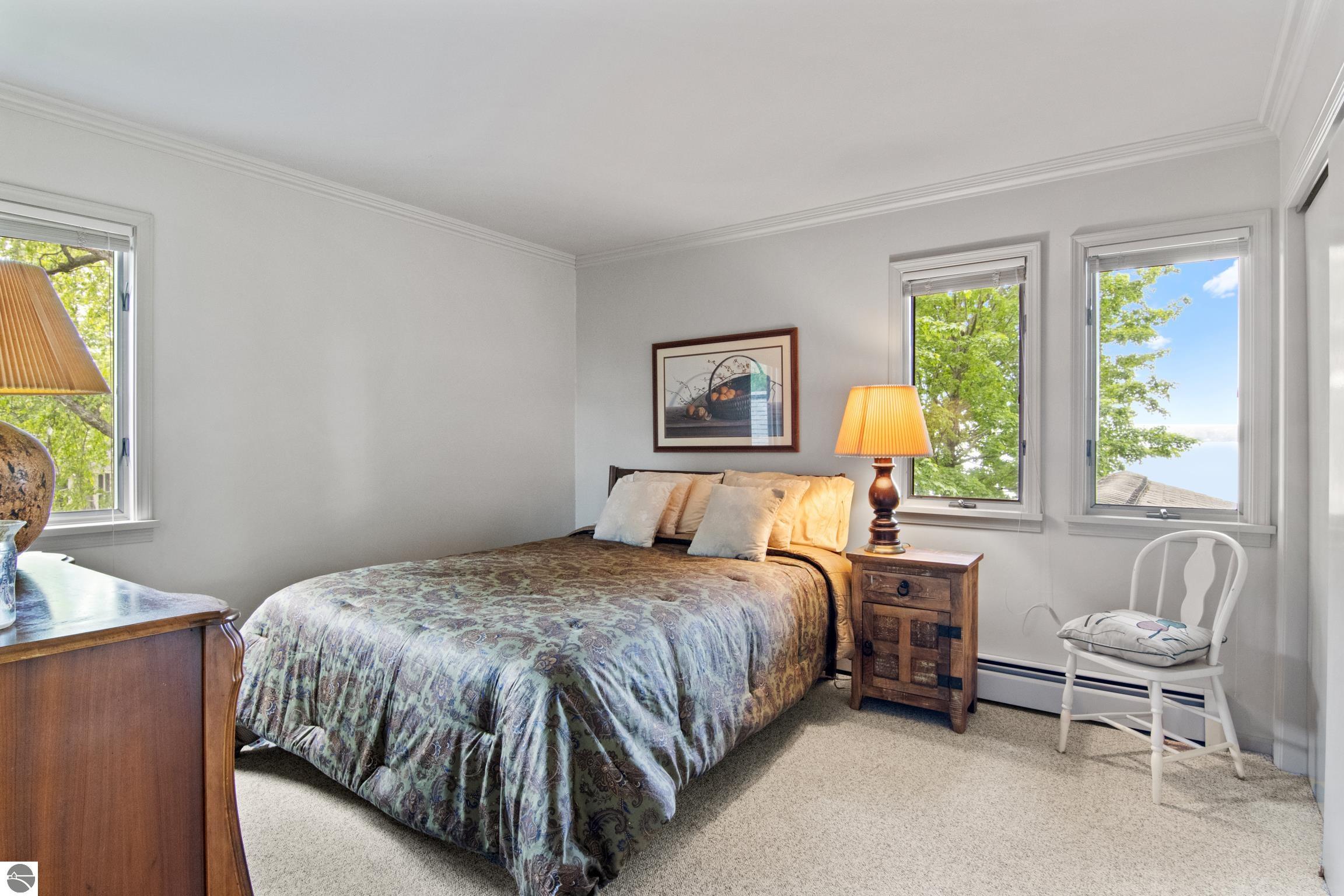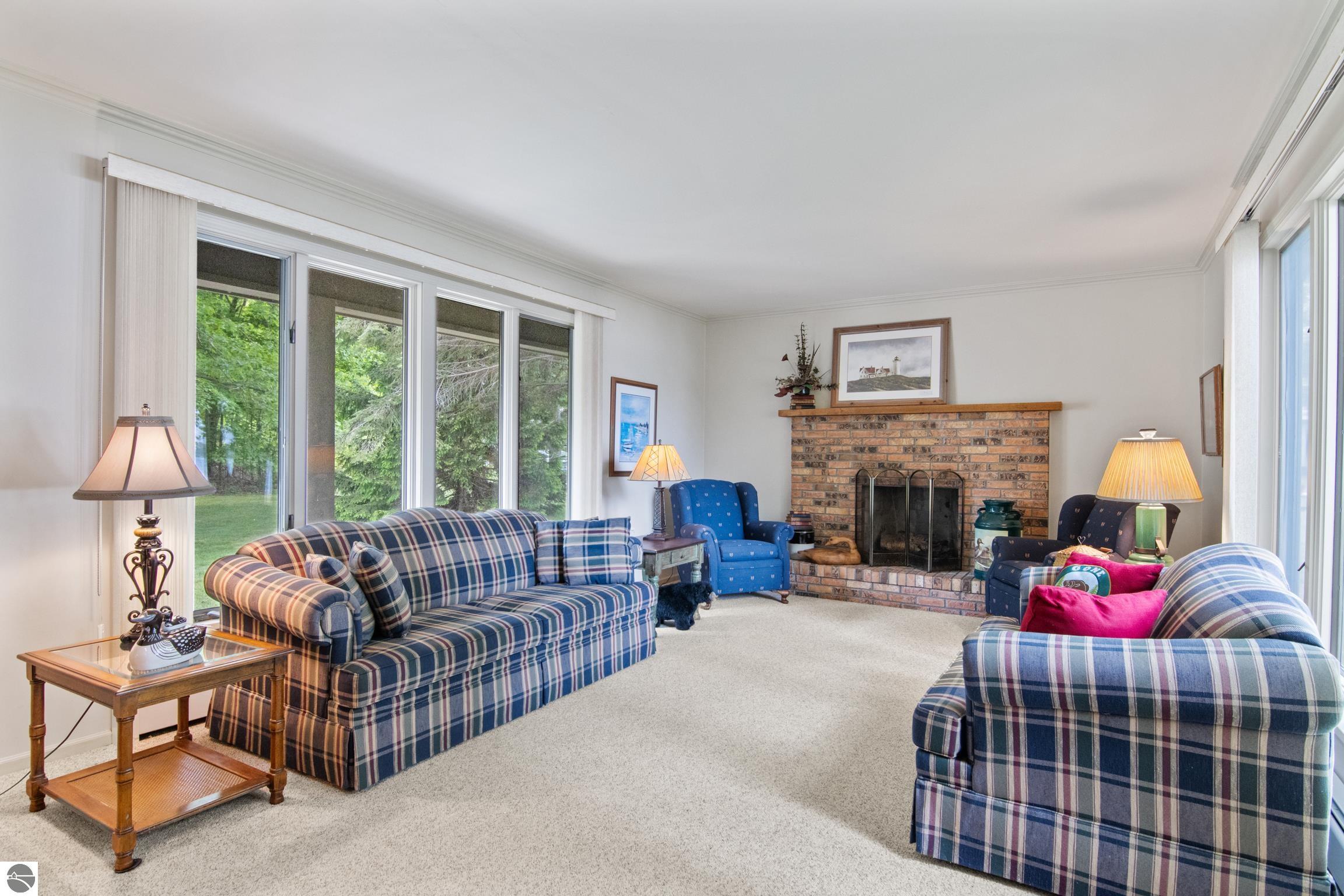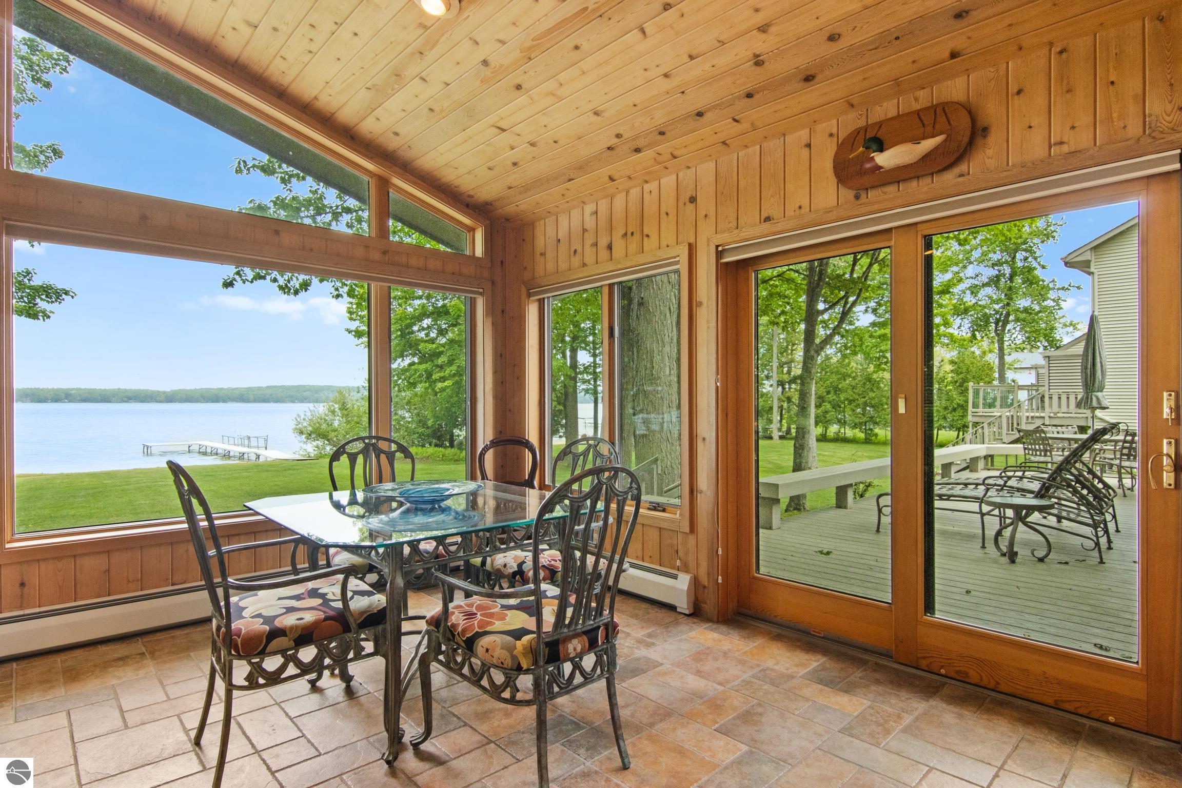 Invite guests to this attractive waterfront home on 1.7 acres with 100 feet of private, direct, sandy-bottom frontage and a dock on all-sports Big Platte Lake. Tucked away on Birch Point, near Sleeping Bear Dunes National Lakeshore property, this four-bedroom, two-bath, air-conditioned home offers an attached garage, a second 1200 sq. ft. garage, and one-quarter interest in an additional 6.3 acres to protect your privacy. The home’s interior features stunning views of the lake from most rooms, starting with Great Room’s soaring window views of the water accented by a wood vaulted ceiling and a sliding door to the deck. Overlooking this room, with its own views of the water, is the cook’s kitchen offering dual, built-in wall ovens, a Viking stainless gas stove with griddle, enormous counter space and lots of cupboards for cookware and pantry items. A tiled floor and backsplash provide easy kitchen clean-up. A cozy, living room, also with lake views, includes a wood-burning fireplace with a brick hearth and plenty of space for reading, watching TV or snuggling with pets. Also on the main level are two bedrooms. The primary bedroom has a private door to the shared bath with a tiled shower. The second bedroom has a slider to the lake-facing deck, and an entry to the mud/laundry room with washer-dryer, sink and cabinets. Upstairs are two more bedrooms, a full bath, and large storage space under the eaves. Amenities include cable TV/internet, natural gas forced-air and baseboard heating, and a lawn sprinkler system. The grassy, manicured yard includes tasteful landscaping and the back lawn leads to the sandy shore. Sit in a rocker on your covered front porch, or relax in a lounge chaise on the deck. It’s an easy, pretty drive to the hoppin’ city of Frankfort and villages of Honor and Beulah. Right around the corner, across M-22, are trails leading to Lake Michigan. Paddle from your private frontage on Big Platte Lake all the way to Lake Michigan.