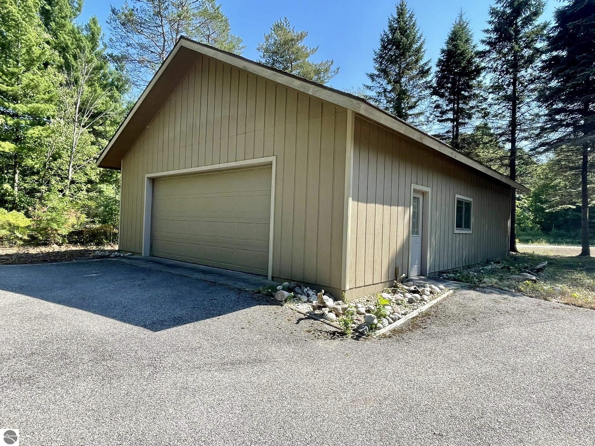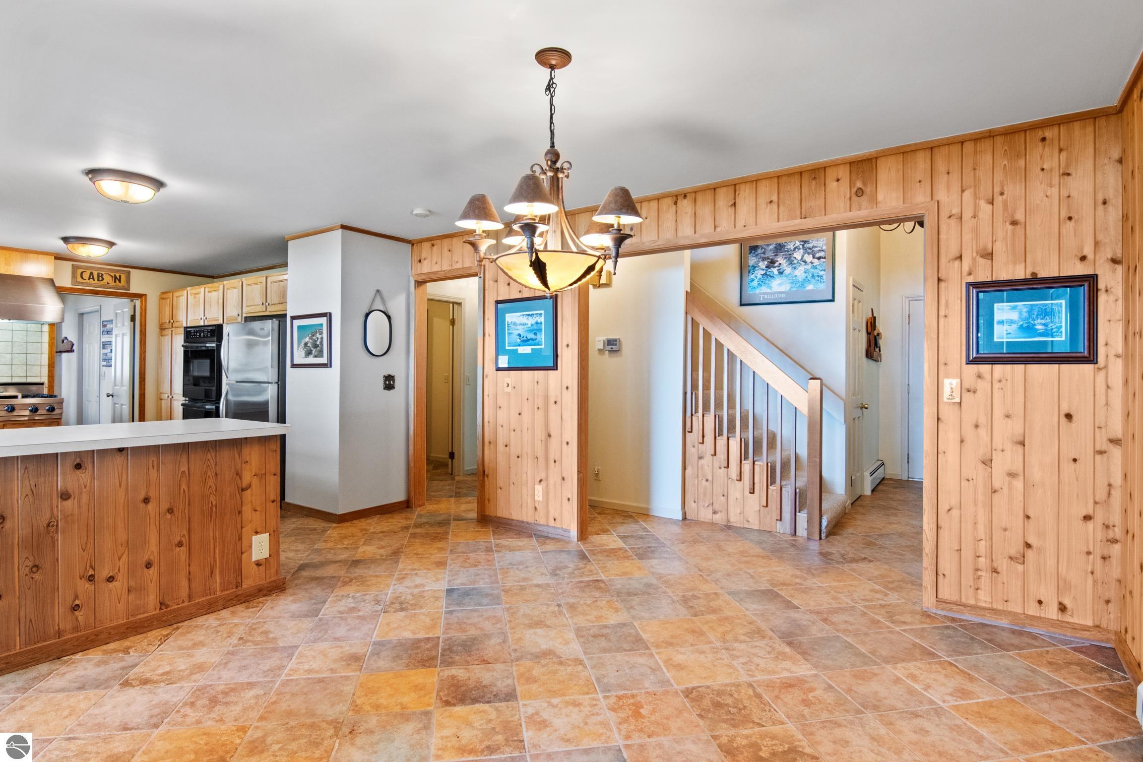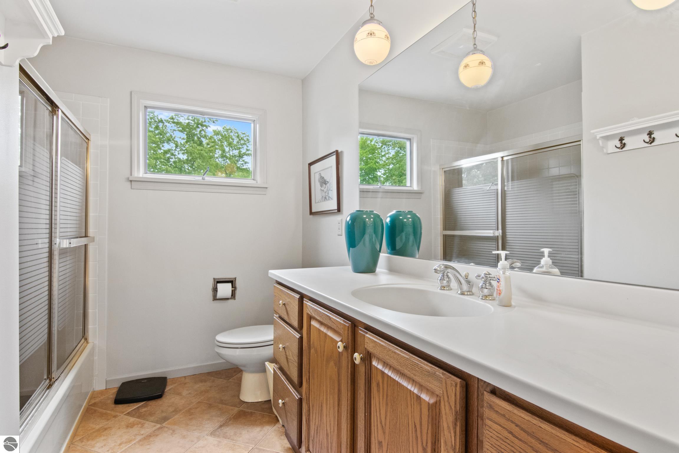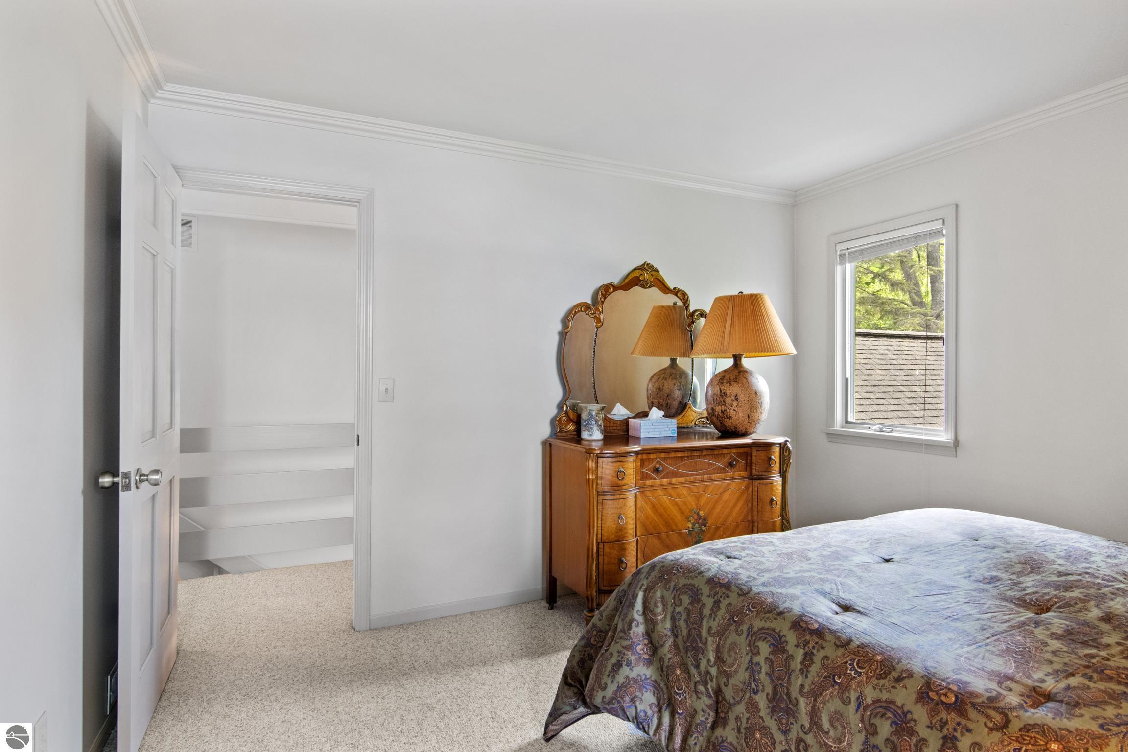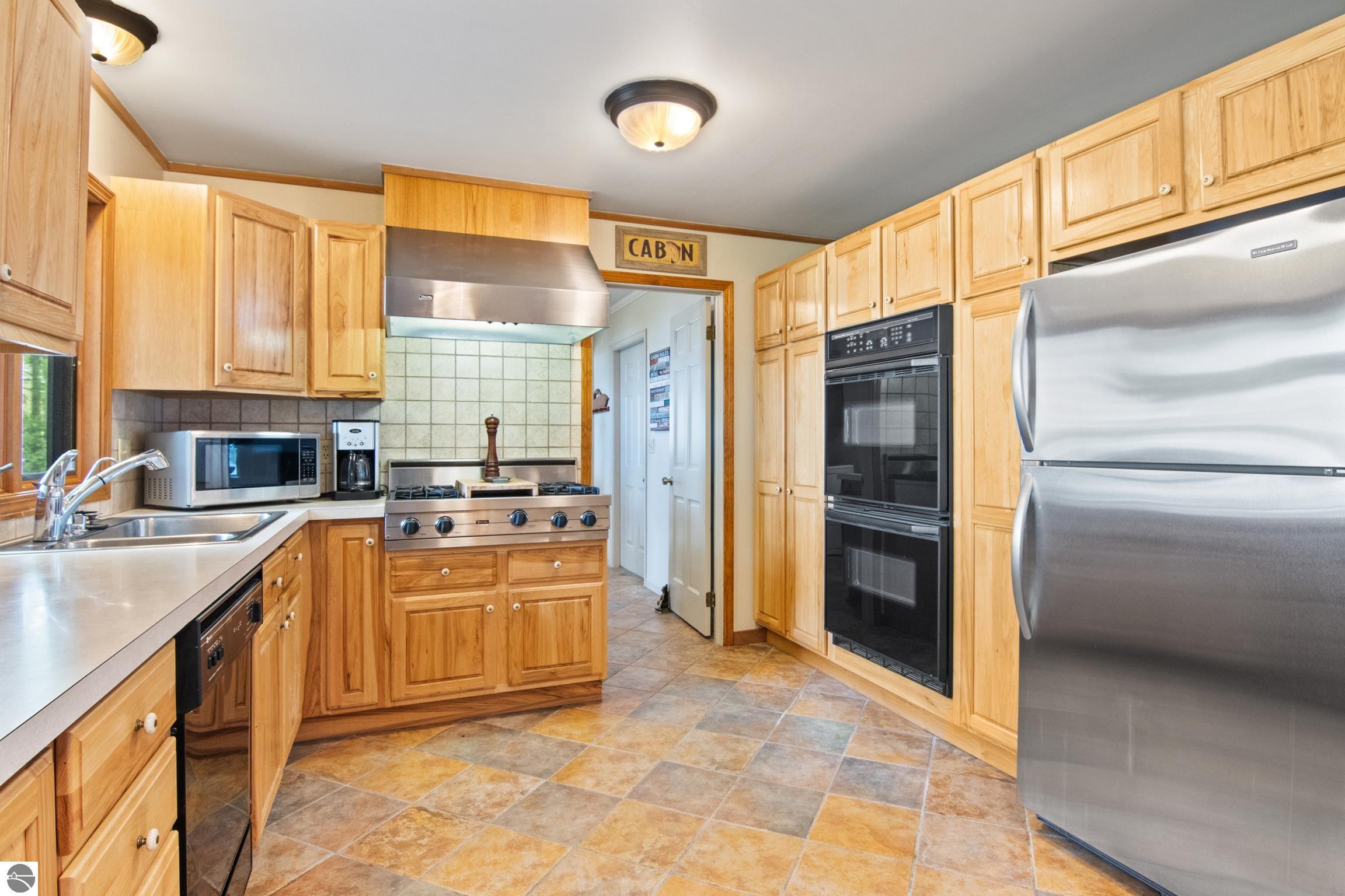 Invite guests to this attractive waterfront home on 1.7 acres with 100 feet of private, direct, sandy-bottom frontage and a dock on all-sports Big Platte Lake. Tucked away on Birch Point, near Sleeping Bear Dunes National Lakeshore property, this four-bedroom, two-bath, air-conditioned home offers an attached garage, a second 1200 sq. ft. garage, and one-quarter interest in an additional 6.3 acres to protect your privacy. The home’s interior features stunning views of the lake from most rooms, starting with Great Room’s soaring window views of the water accented by a wood vaulted ceiling and a sliding door to the deck. Overlooking this room, with its own views of the water, is the cook’s kitchen offering dual, built-in wall ovens, a Viking stainless gas stove with griddle, enormous counter space and lots of cupboards for cookware and pantry items. A tiled floor and backsplash provide easy kitchen clean-up. A cozy, living room, also with lake views, includes a wood-burning fireplace with a brick hearth and plenty of space for reading, watching TV or snuggling with pets. Also on the main level are two bedrooms. The primary bedroom has a private door to the shared bath with a tiled shower. The second bedroom has a slider to the lake-facing deck, and an entry to the mud/laundry room with washer-dryer, sink and cabinets. Upstairs are two more bedrooms, a full bath, and large storage space under the eaves. Amenities include cable TV/internet, natural gas forced-air and baseboard heating, and a lawn sprinkler system. The grassy, manicured yard includes tasteful landscaping and the back lawn leads to the sandy shore. Sit in a rocker on your covered front porch, or relax in a lounge chaise on the deck. It’s an easy, pretty drive to the hoppin’ city of Frankfort and villages of Honor and Beulah. Right around the corner, across M-22, are trails leading to Lake Michigan. Paddle from your private frontage on Big Platte Lake all the way to Lake Michigan.