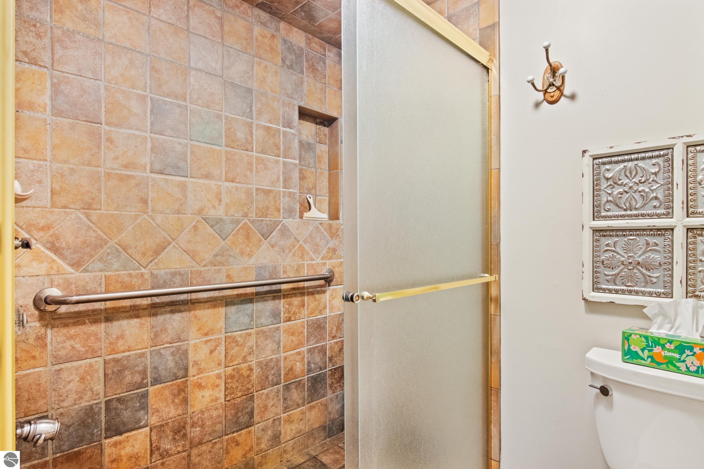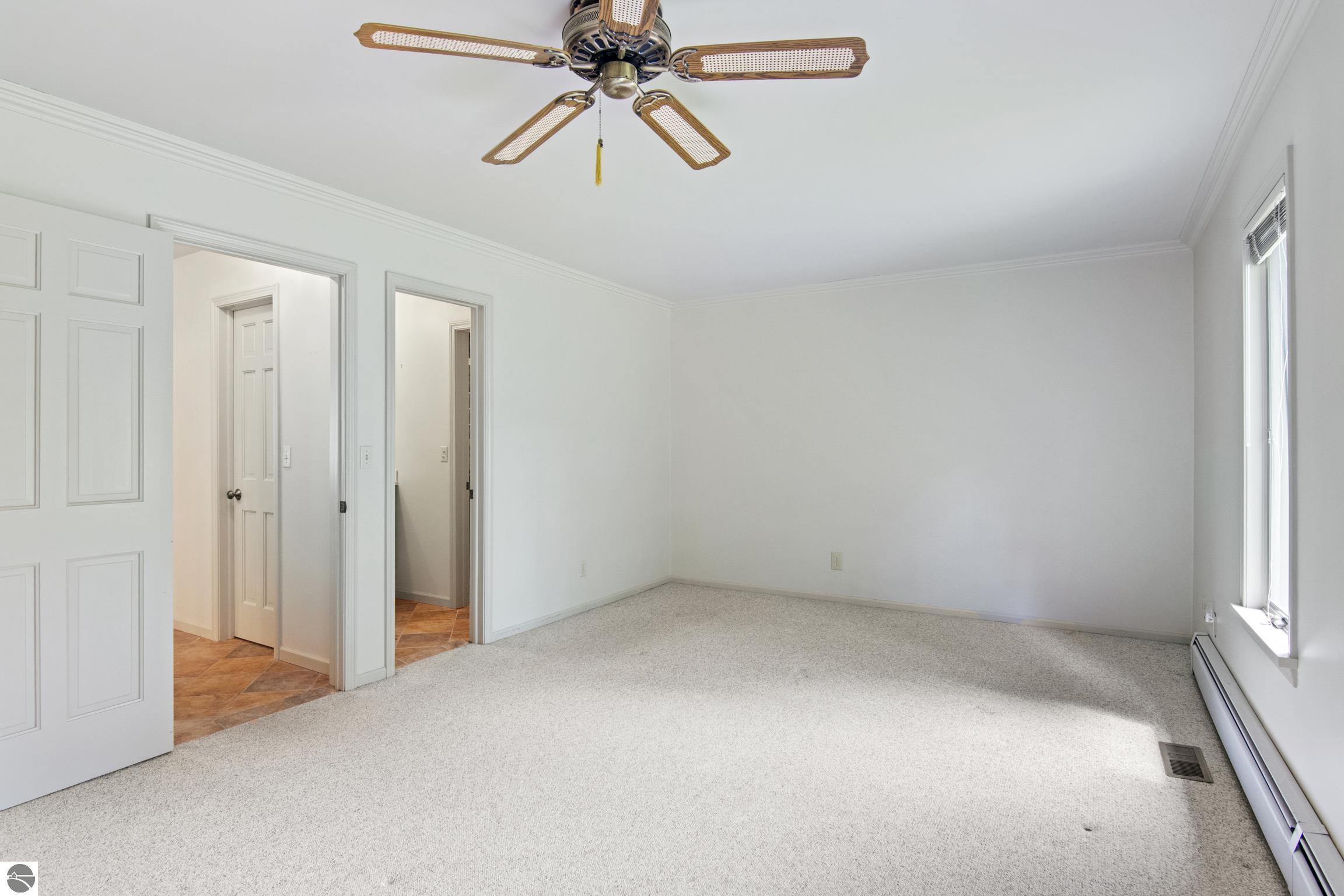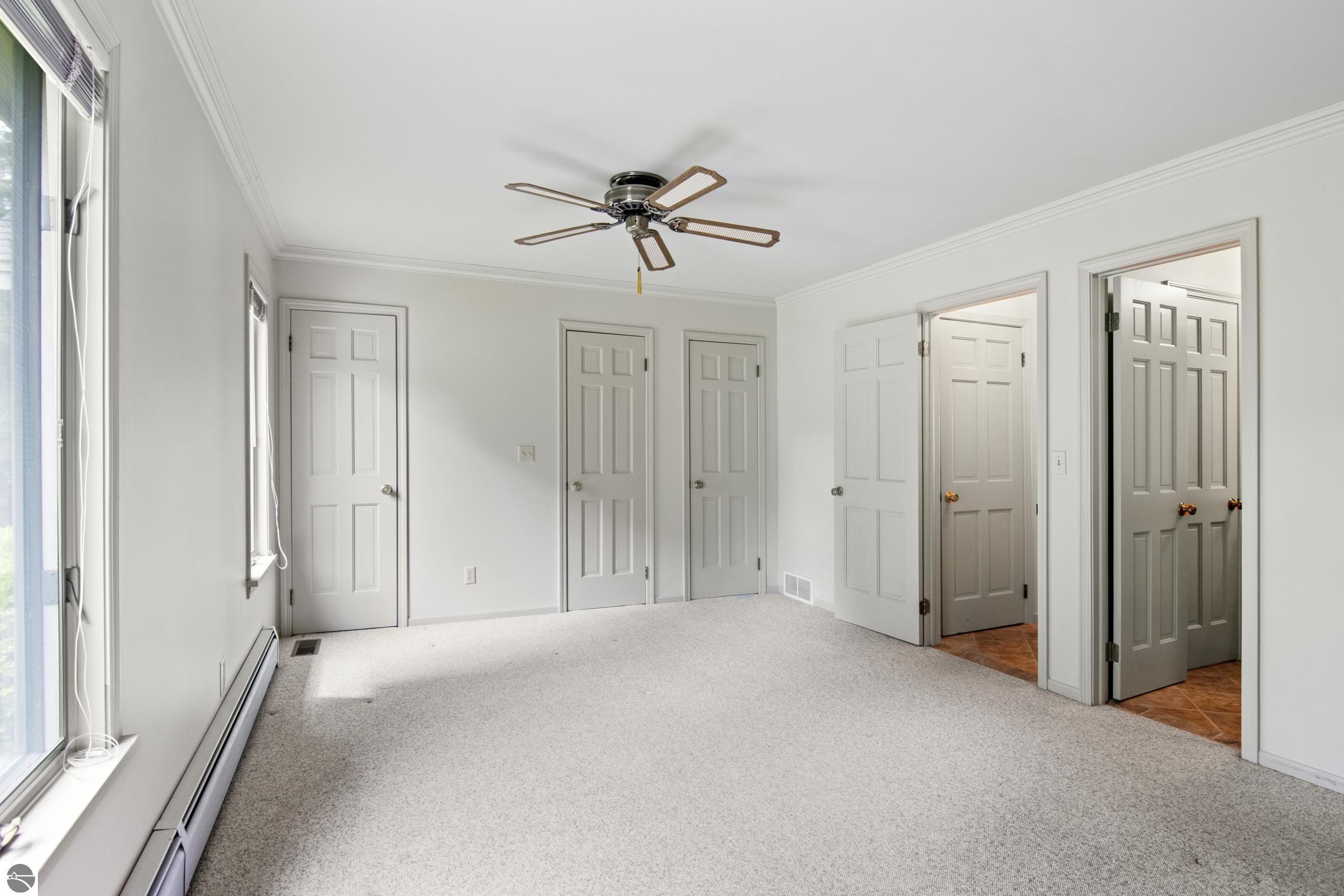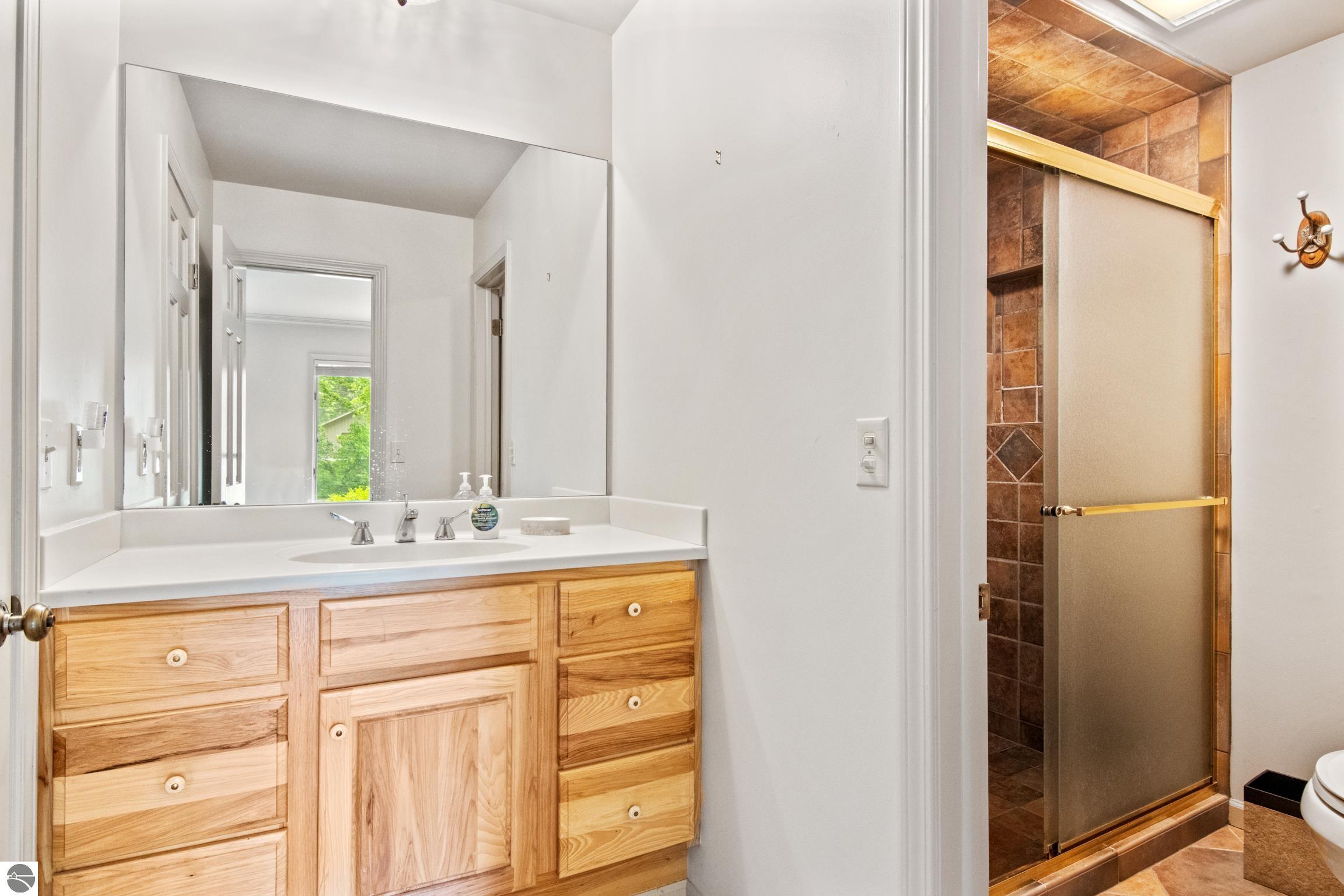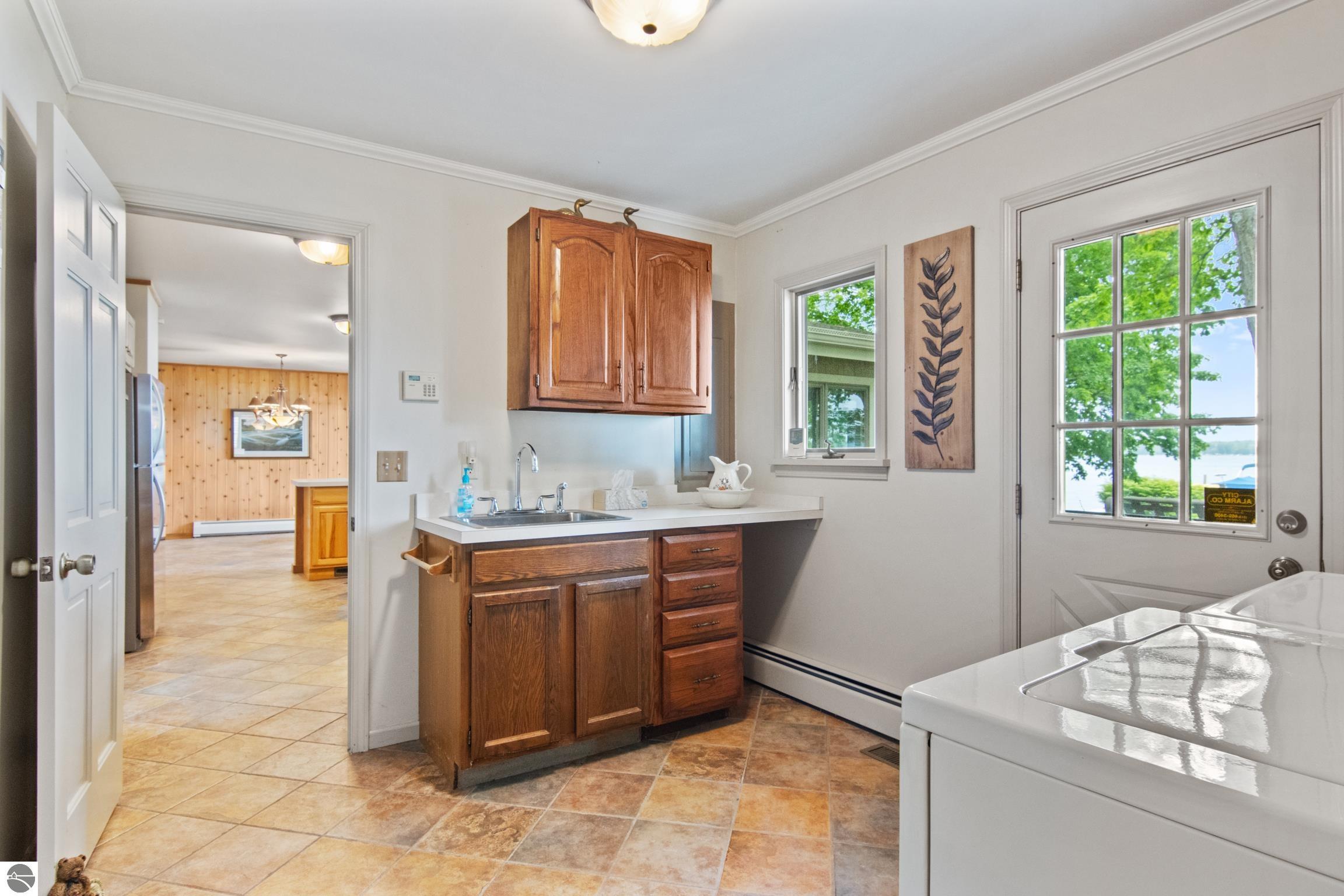 Invite guests to this attractive waterfront home on 1.7 acres with 100 feet of private, direct, sandy-bottom frontage and a dock on all-sports Big Platte Lake. Tucked away on Birch Point, near Sleeping Bear Dunes National Lakeshore property, this four-bedroom, two-bath, air-conditioned home offers an attached garage, a second 1200 sq. ft. garage, and one-quarter interest in an additional 6.3 acres to protect your privacy. The home’s interior features stunning views of the lake from most rooms, starting with Great Room’s soaring window views of the water accented by a wood vaulted ceiling and a sliding door to the deck. Overlooking this room, with its own views of the water, is the cook’s kitchen offering dual, built-in wall ovens, a Viking stainless gas stove with griddle, enormous counter space and lots of cupboards for cookware and pantry items. A tiled floor and backsplash provide easy kitchen clean-up. A cozy, living room, also with lake views, includes a wood-burning fireplace with a brick hearth and plenty of space for reading, watching TV or snuggling with pets. Also on the main level are two bedrooms. The primary bedroom has a private door to the shared bath with a tiled shower. The second bedroom has a slider to the lake-facing deck, and an entry to the mud/laundry room with washer-dryer, sink and cabinets. Upstairs are two more bedrooms, a full bath, and large storage space under the eaves. Amenities include cable TV/internet, natural gas forced-air and baseboard heating, and a lawn sprinkler system. The grassy, manicured yard includes tasteful landscaping and the back lawn leads to the sandy shore. Sit in a rocker on your covered front porch, or relax in a lounge chaise on the deck. It’s an easy, pretty drive to the hoppin’ city of Frankfort and villages of Honor and Beulah. Right around the corner, across M-22, are trails leading to Lake Michigan. Paddle from your private frontage on Big Platte Lake all the way to Lake Michigan.
