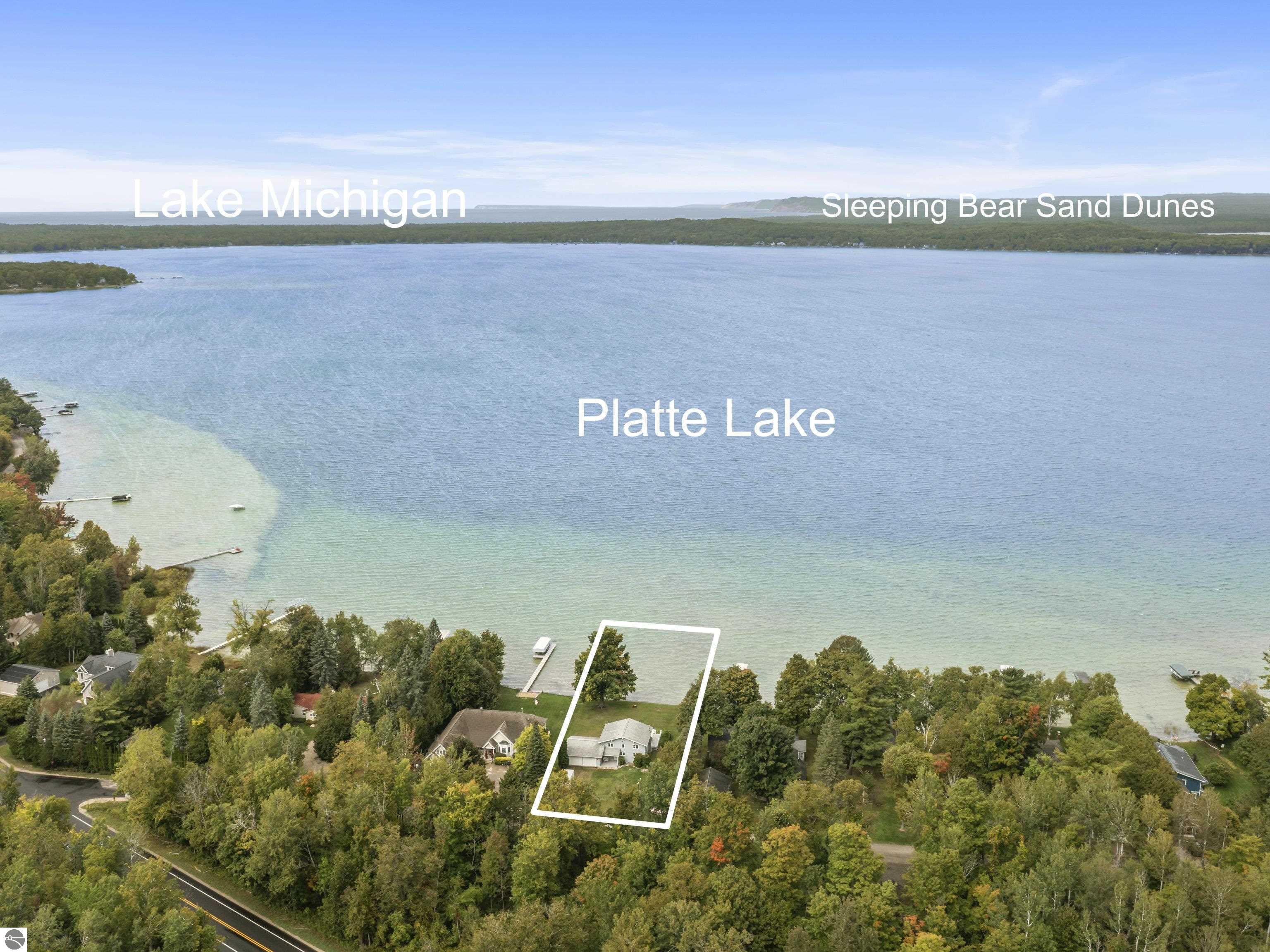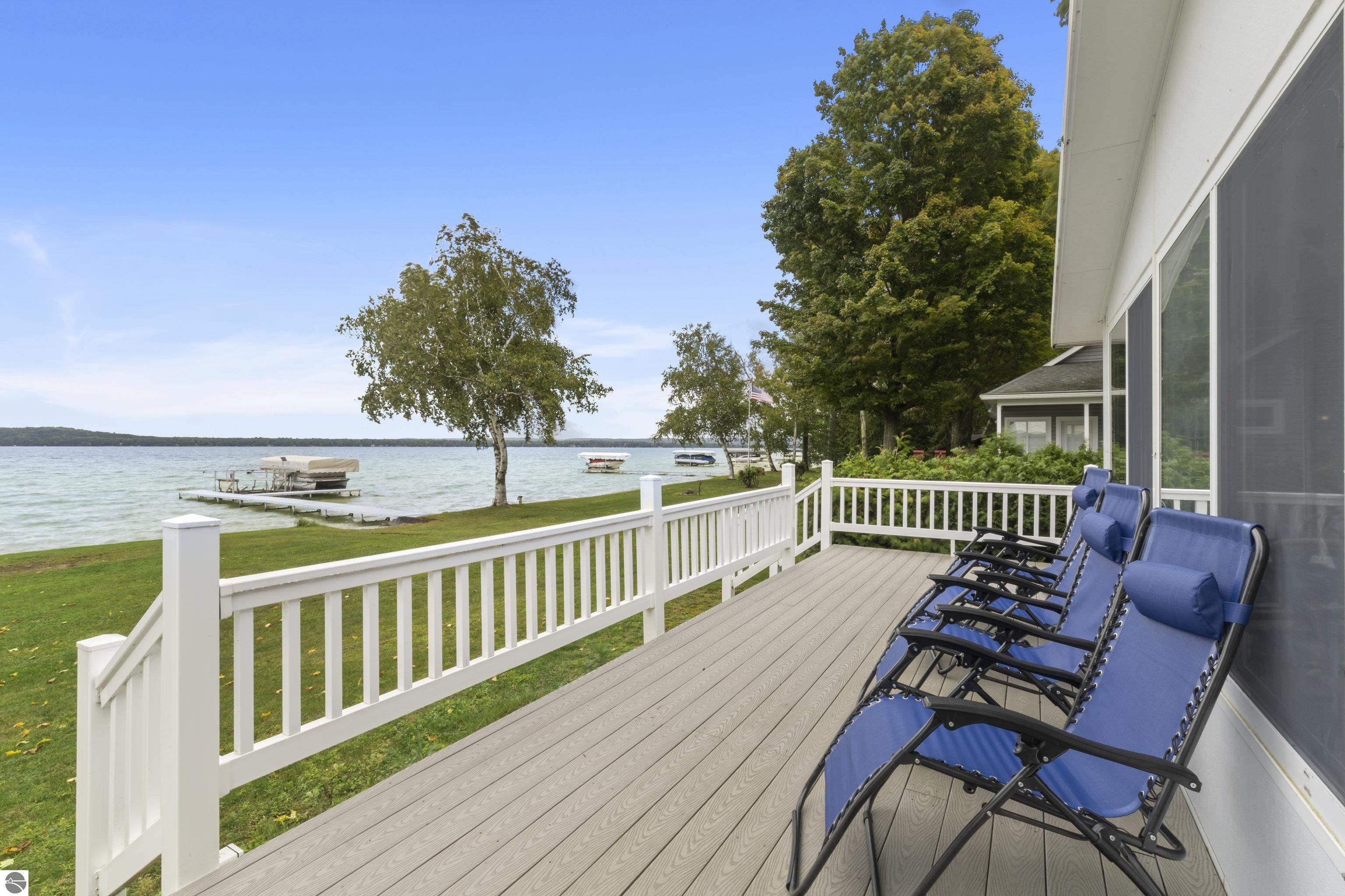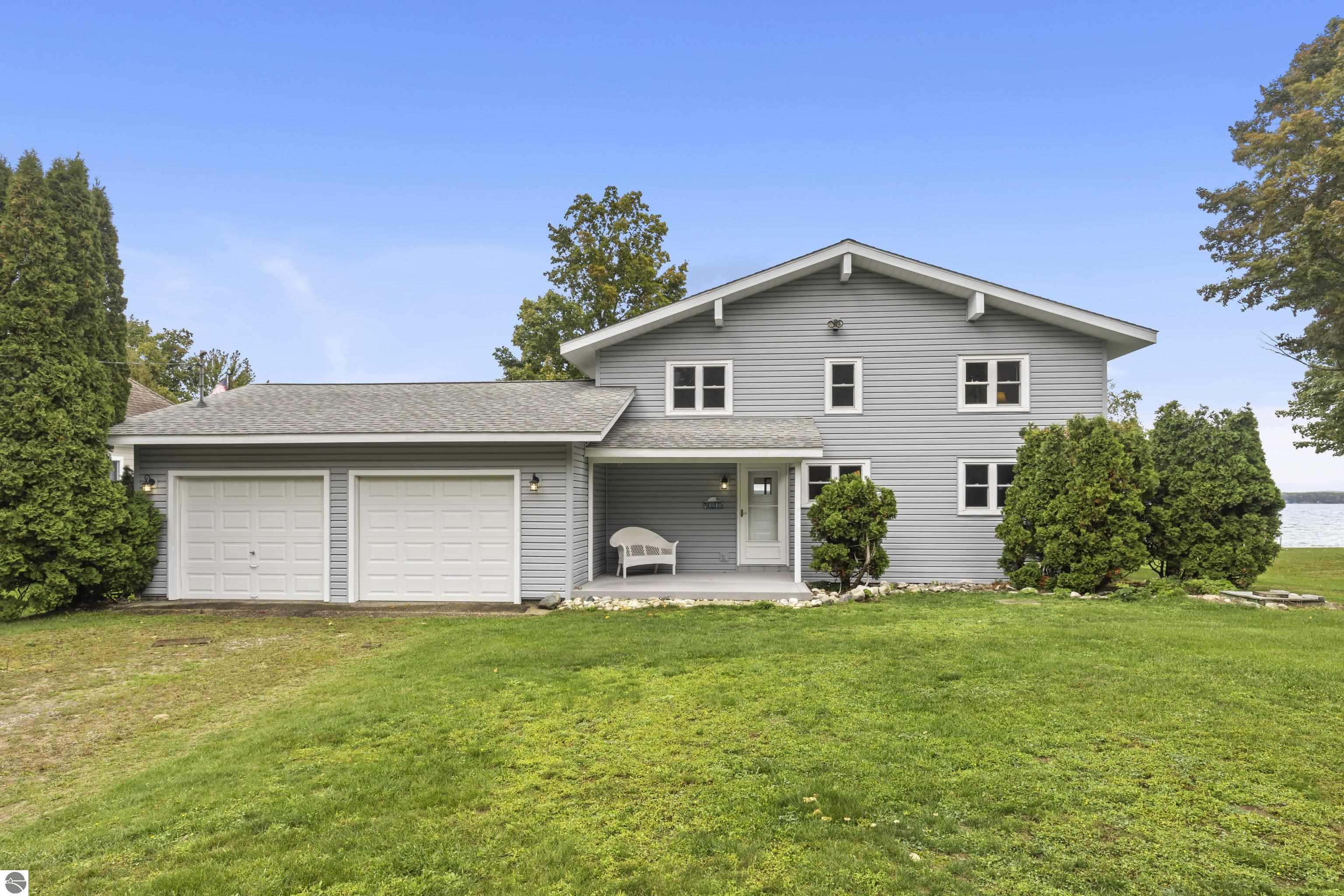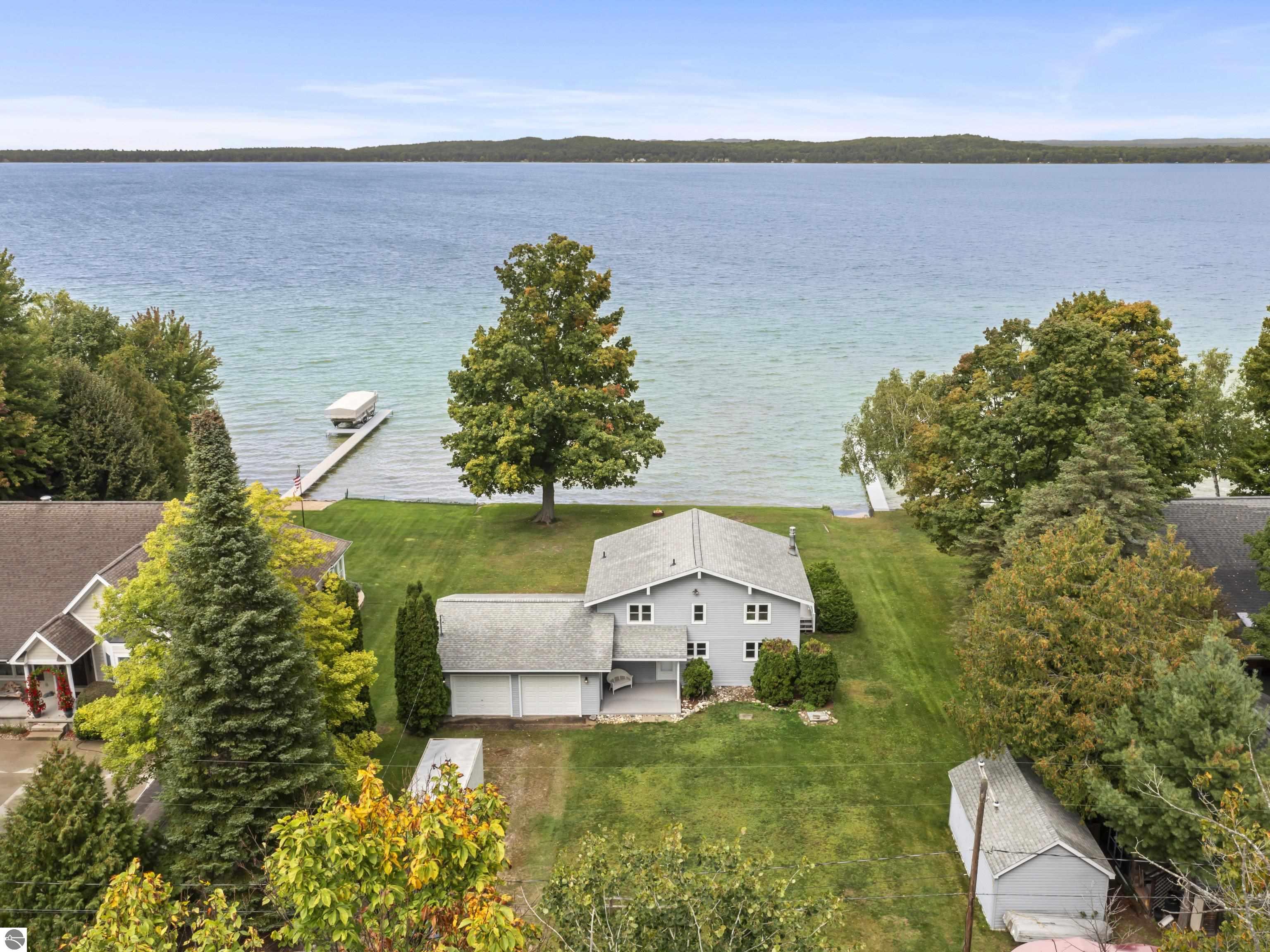 Waterfront 3 BR, 2 BA home with 100 ft private frontage on all-sports Big Platte Lake near the Sleeping Bear Dunes National Lakeshore in Benzie County. Sweeping views across the entire lake from this quiet setting off the main road. Hard sandy-bottom lakefront with seawall and concrete ramp. Year-round home is turnkey with furnishings and features a lakeside sunroom, all new windows, new kitchen and appliances, and new maintenance free Trek decking. The living room cathedral ceiling rises above a fireplace with a WIFI controlled Majestic furnace insert for whole house heat upon demand. An upstairs loft lends bonus sleeping space. Refresh the interior with your personal touches. The 2-car, insulated, attached garage has a kitchen for summer get-togethers. Store the boats and yard equipment in the detached garage. Nice level front and back yards for recreation. Big Platte Lake is known for boating, swimming and fishing. Kayak down the Platte River to Lake Michigan from here.