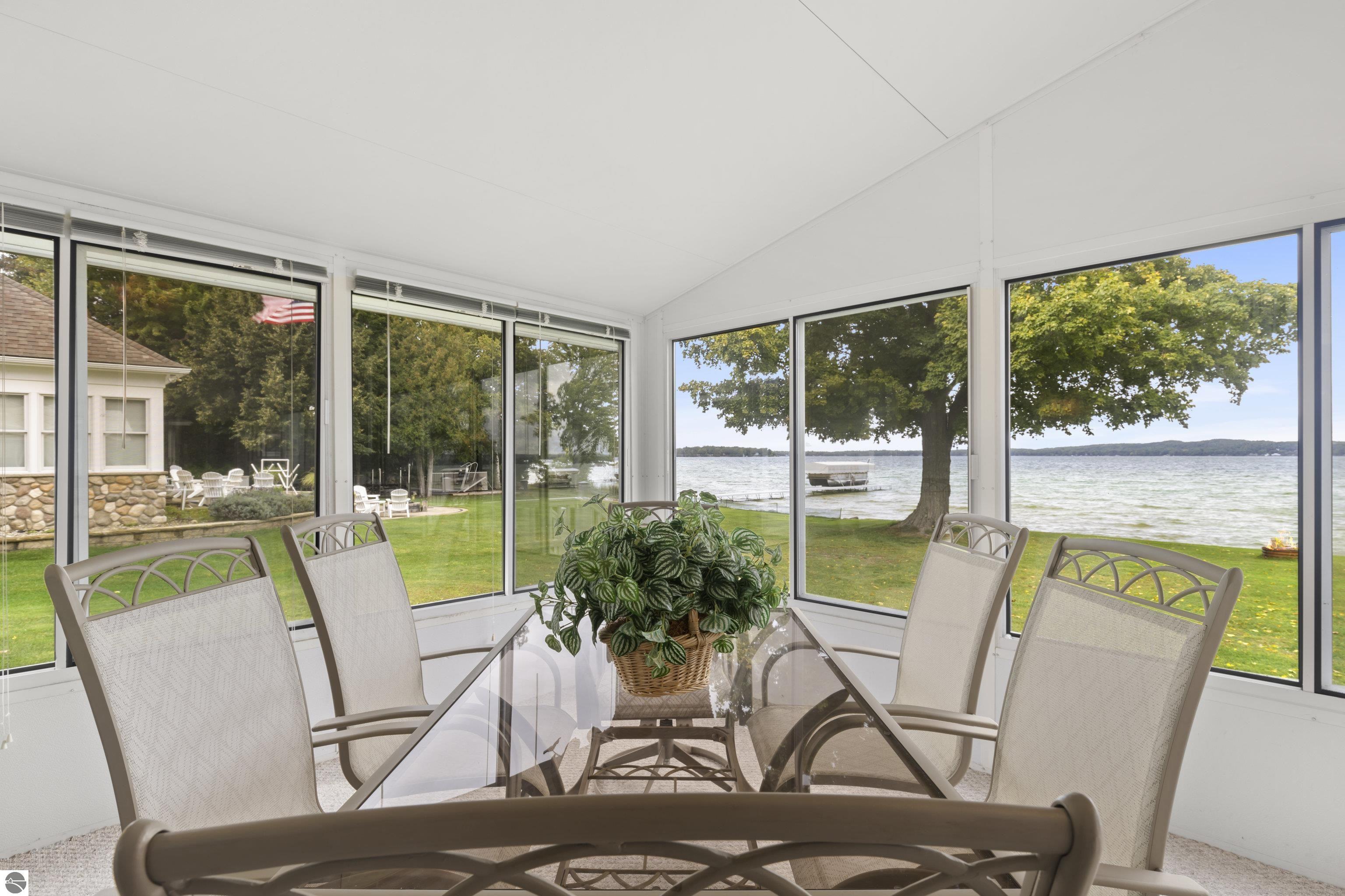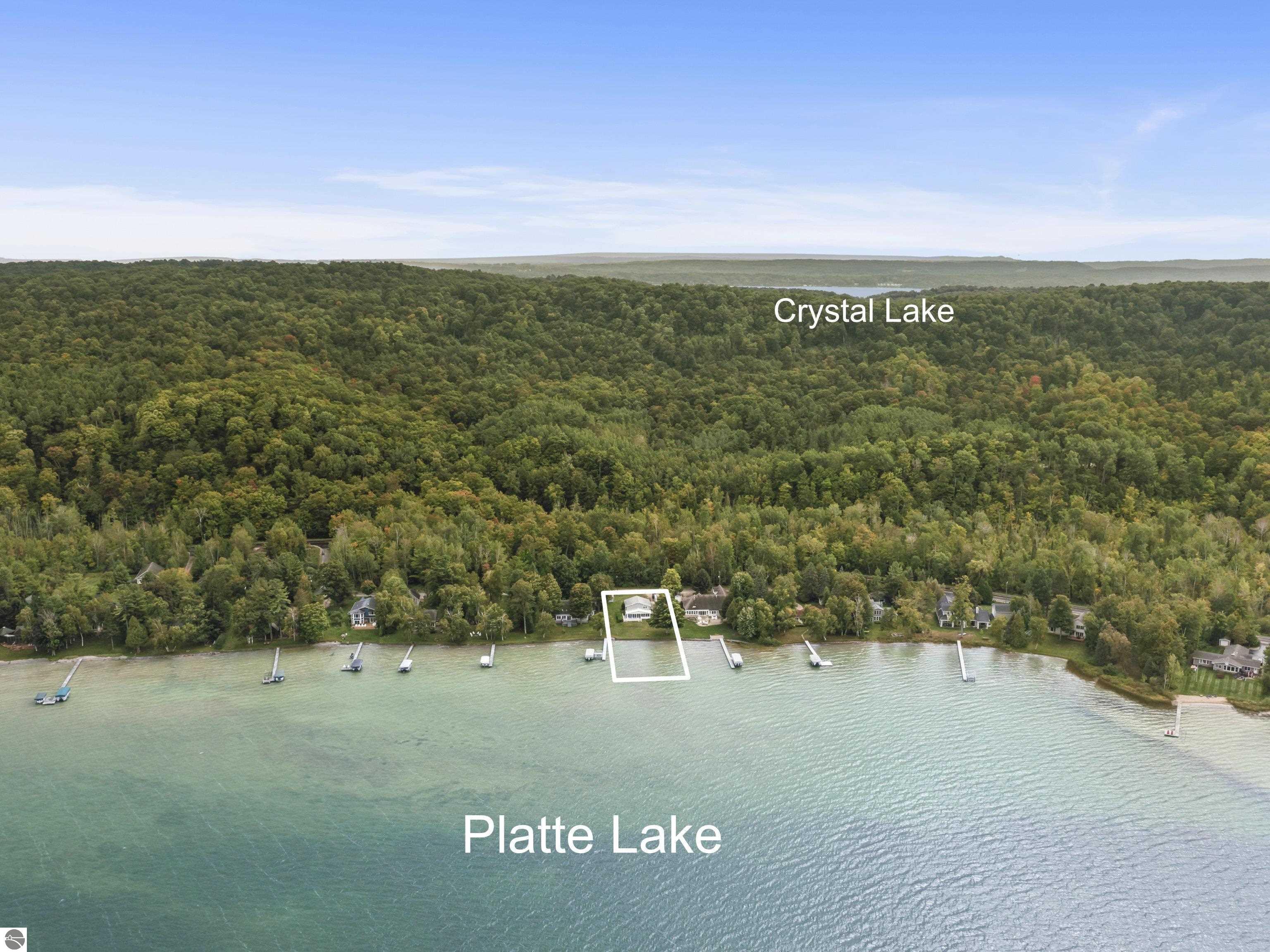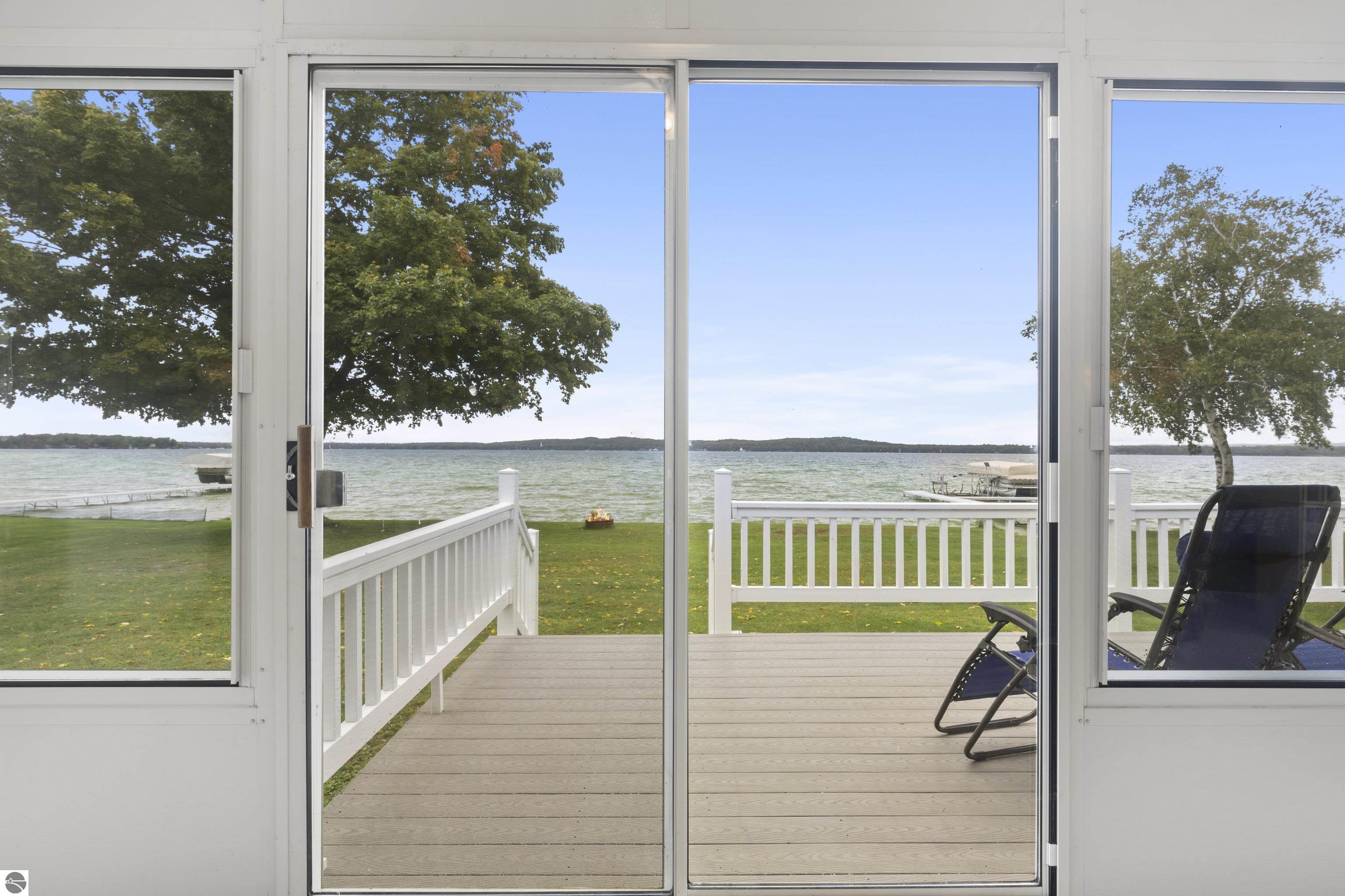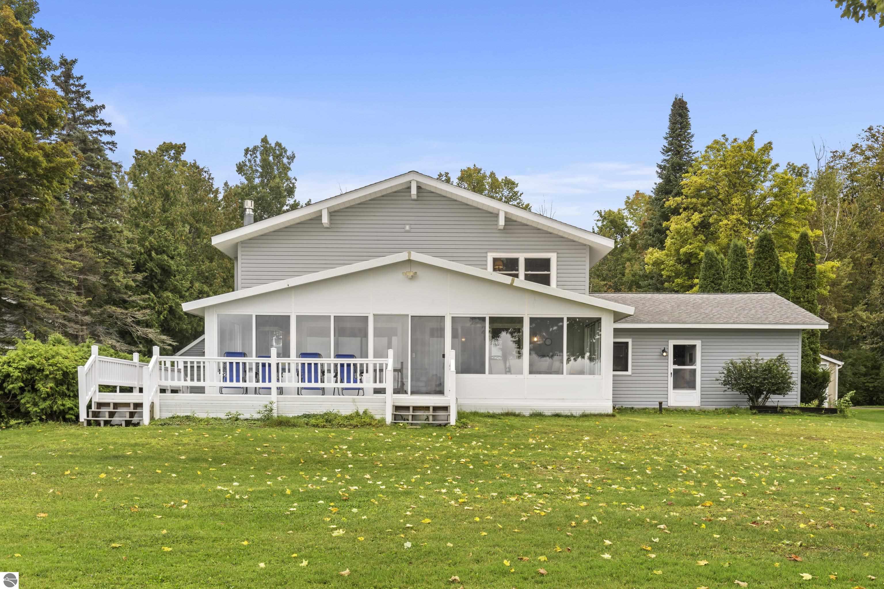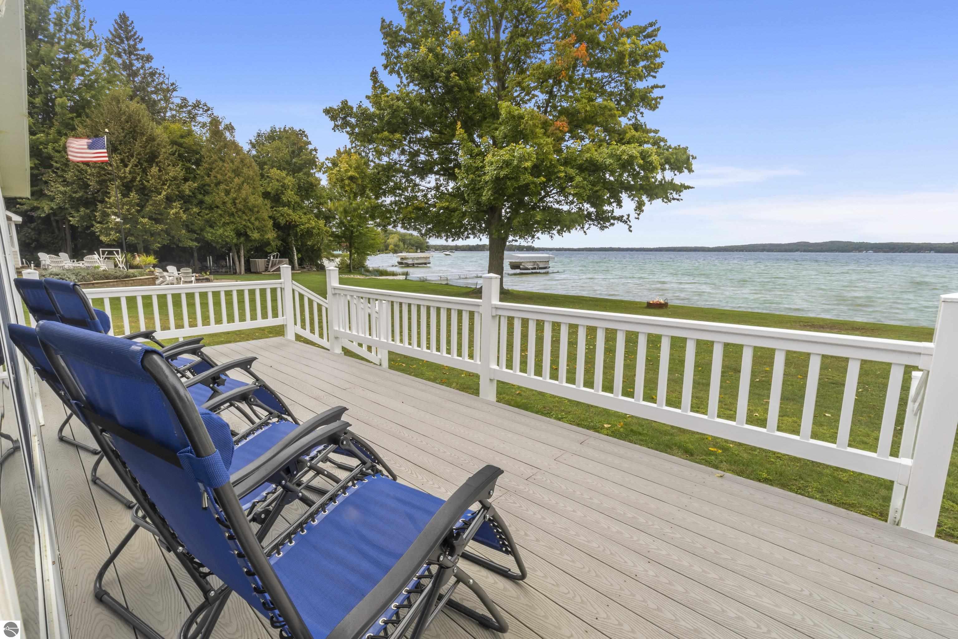 Waterfront 3 BR, 2 BA home with 100 ft private frontage on all-sports Big Platte Lake near the Sleeping Bear Dunes National Lakeshore in Benzie County. Sweeping views across the entire lake from this quiet setting off the main road. Hard sandy-bottom lakefront with seawall and concrete ramp. Year-round home is turnkey with furnishings and features a lakeside sunroom, all new windows, new kitchen and appliances, and new maintenance free Trek decking. The living room cathedral ceiling rises above a fireplace with a WIFI controlled Majestic furnace insert for whole house heat upon demand. An upstairs loft lends bonus sleeping space. Refresh the interior with your personal touches. The 2-car, insulated, attached garage has a kitchen for summer get-togethers. Store the boats and yard equipment in the detached garage. Nice level front and back yards for recreation. Big Platte Lake is known for boating, swimming and fishing. Kayak down the Platte River to Lake Michigan from here.