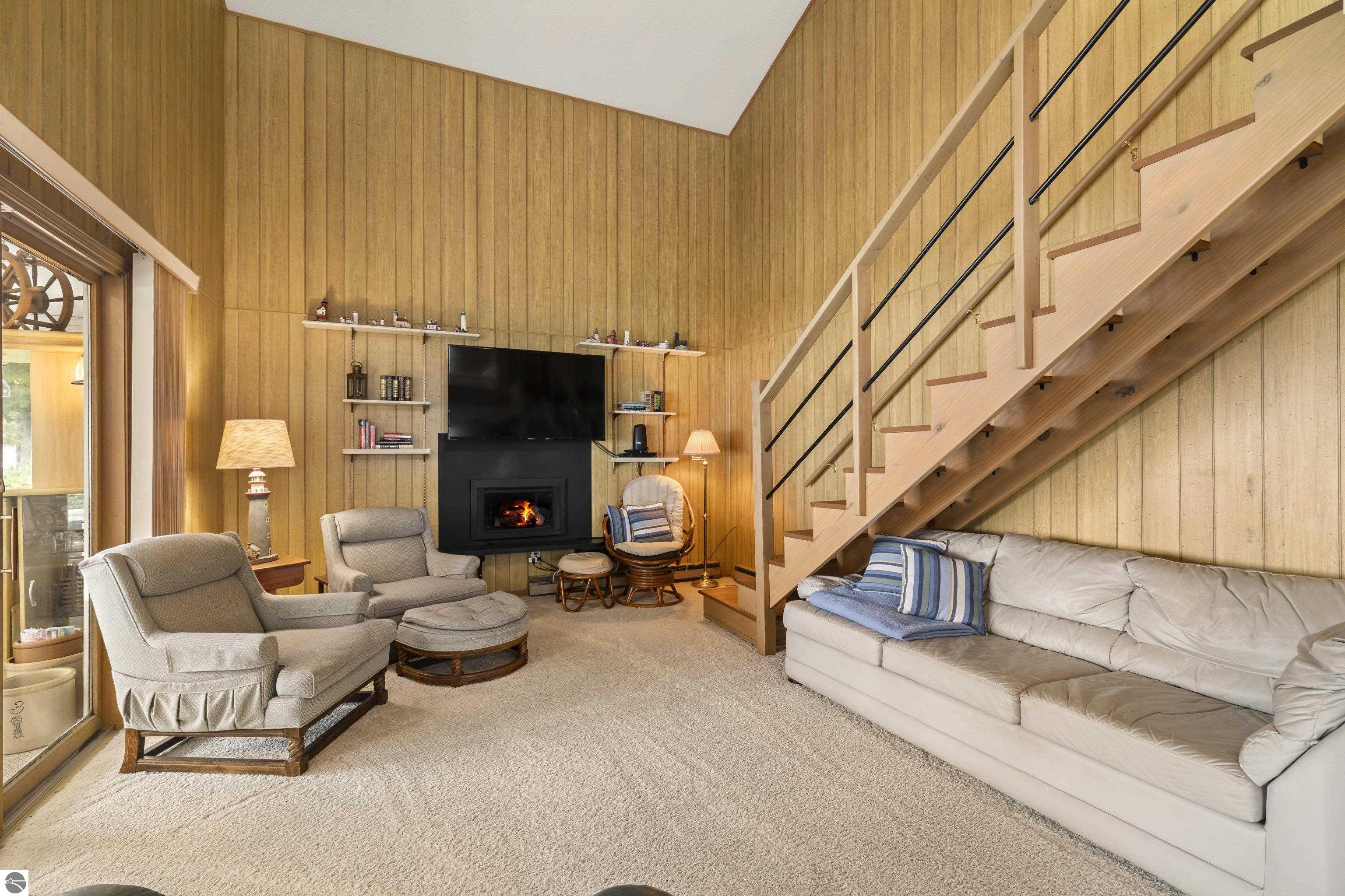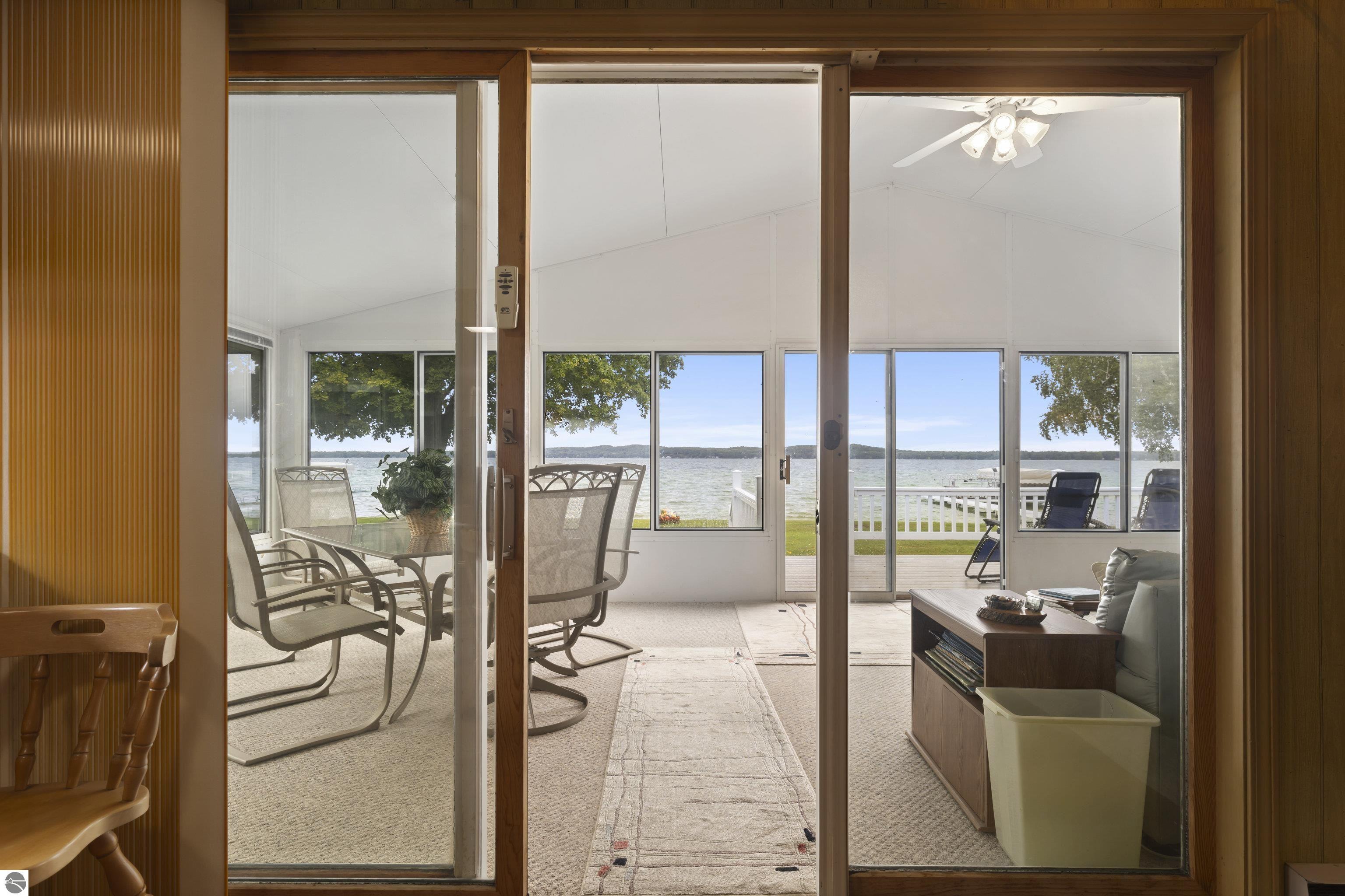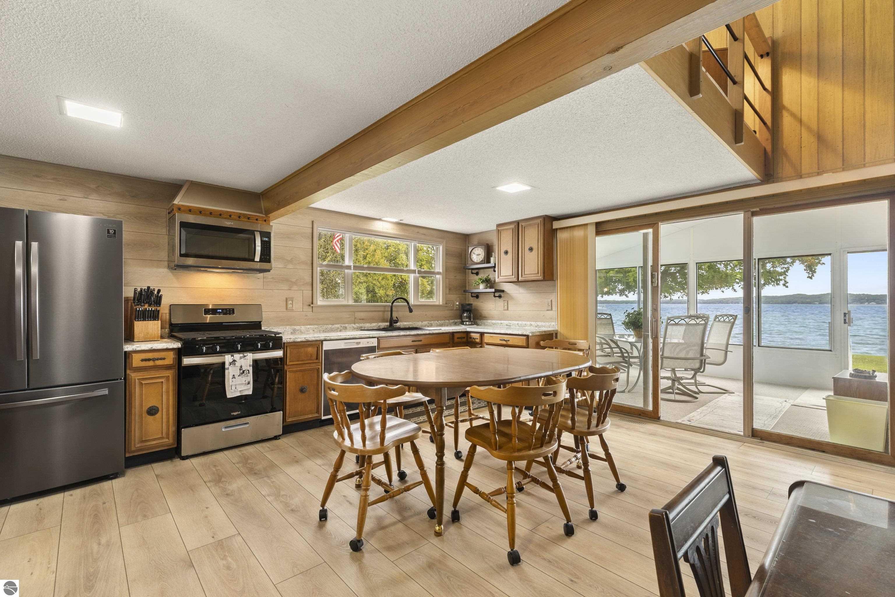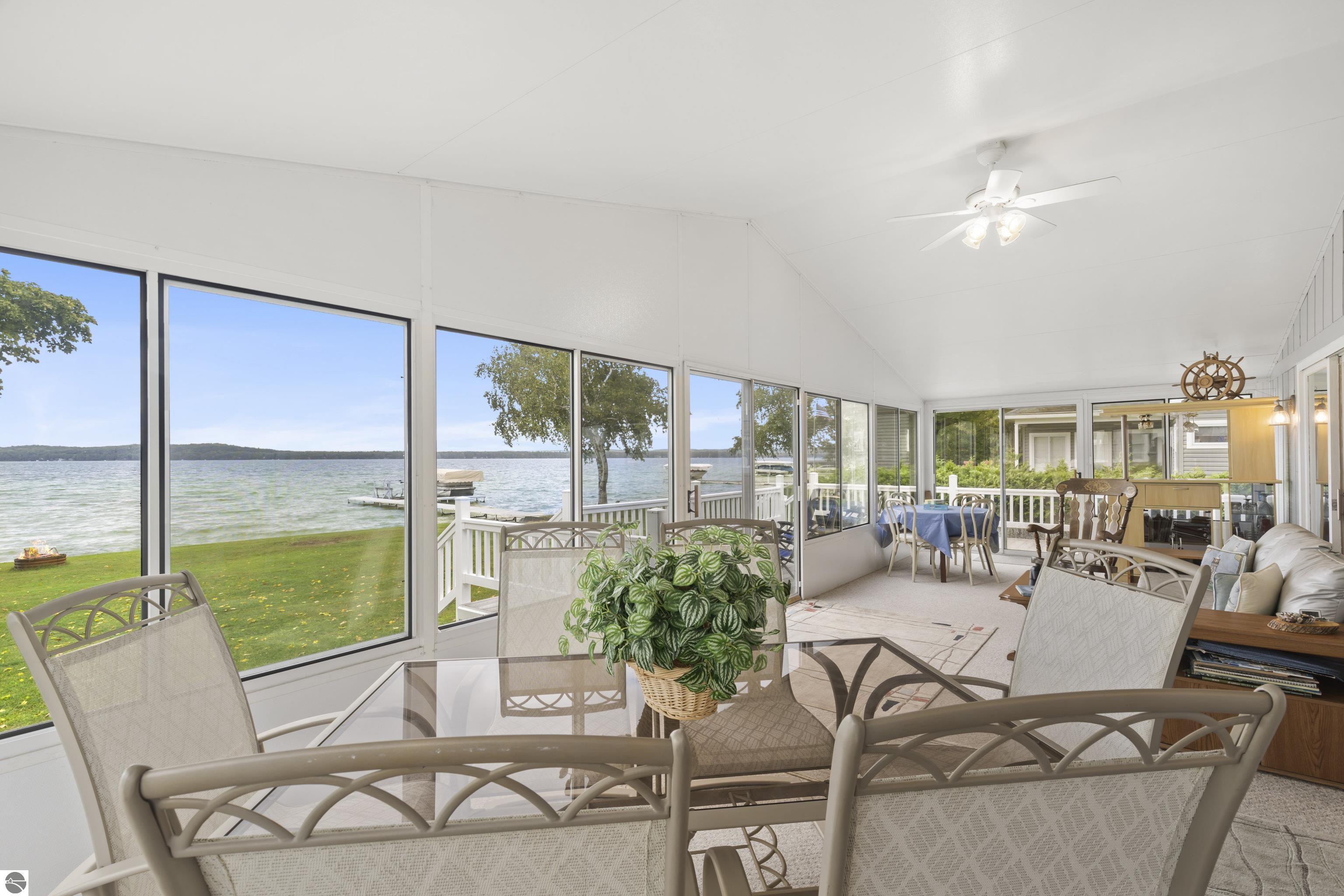 Waterfront 3 BR, 2 BA home with 100 ft private frontage on all-sports Big Platte Lake near the Sleeping Bear Dunes National Lakeshore in Benzie County. Sweeping views across the entire lake from this quiet setting off the main road. Hard sandy-bottom lakefront with seawall and concrete ramp. Year-round home is turnkey with furnishings and features a lakeside sunroom, all new windows, new kitchen and appliances, and new maintenance free Trek decking. The living room cathedral ceiling rises above a fireplace with a WIFI controlled Majestic furnace insert for whole house heat upon demand. An upstairs loft lends bonus sleeping space. Refresh the interior with your personal touches. The 2-car, insulated, attached garage has a kitchen for summer get-togethers. Store the boats and yard equipment in the detached garage. Nice level front and back yards for recreation. Big Platte Lake is known for boating, swimming and fishing. Kayak down the Platte River to Lake Michigan from here.