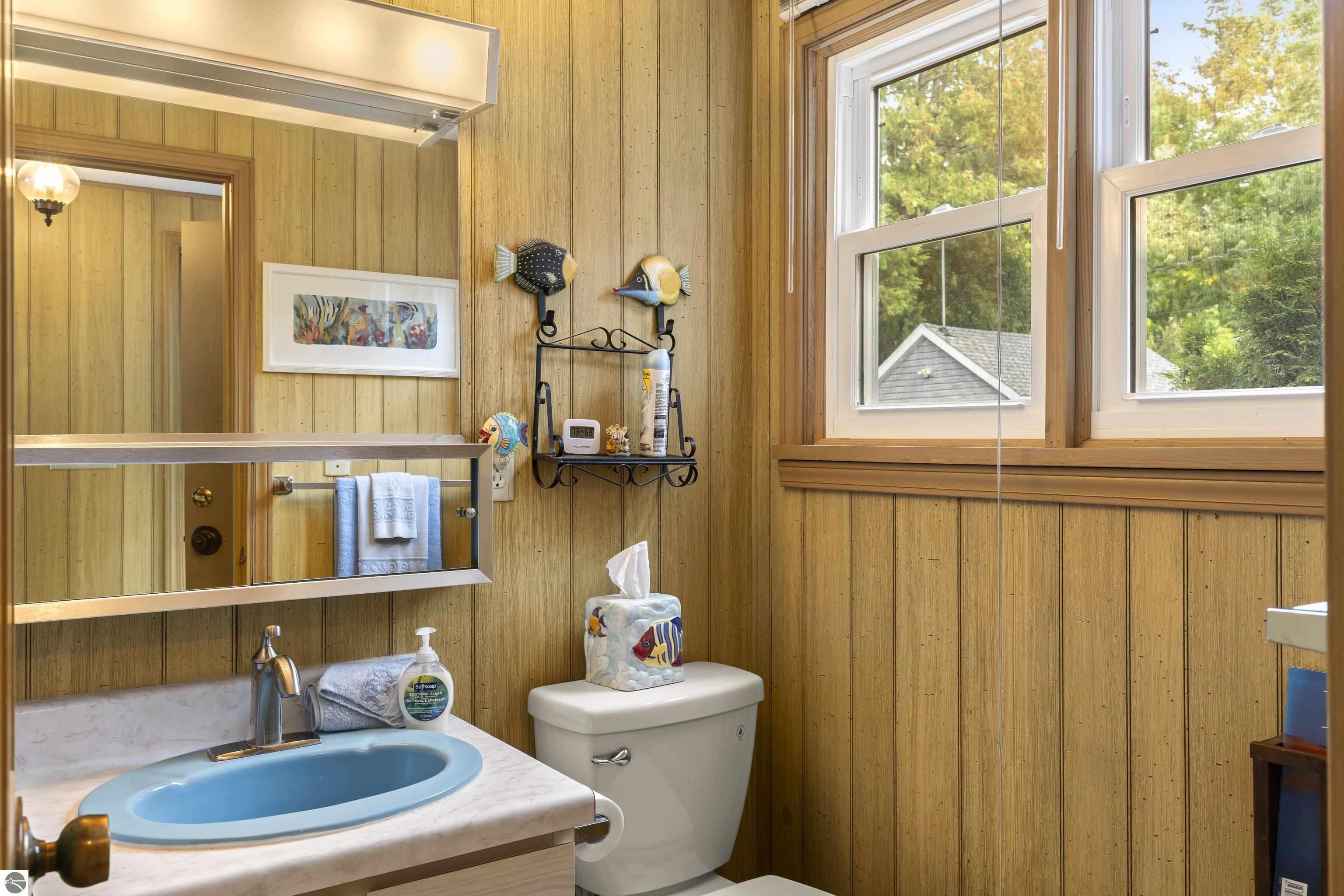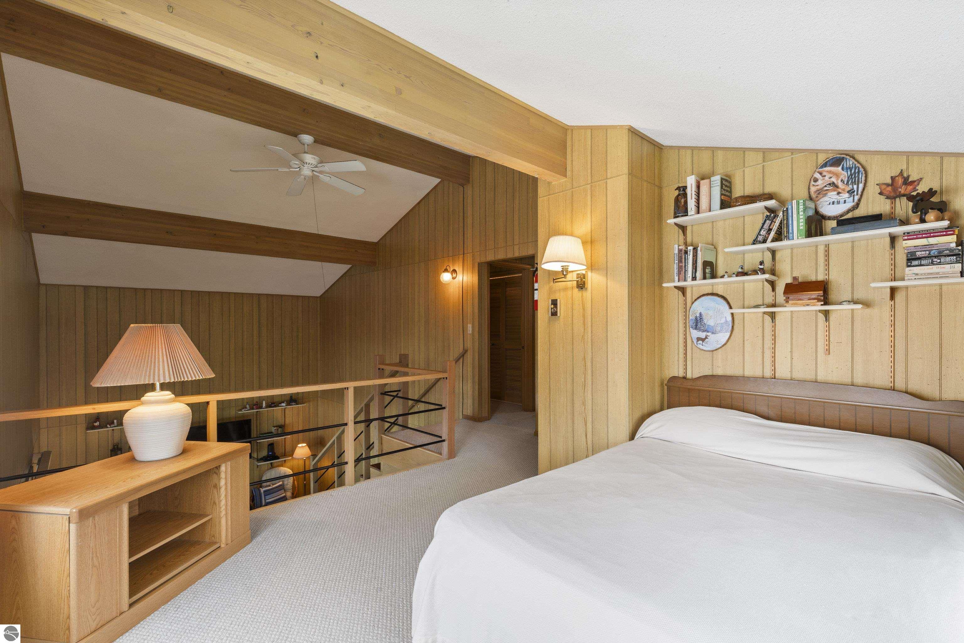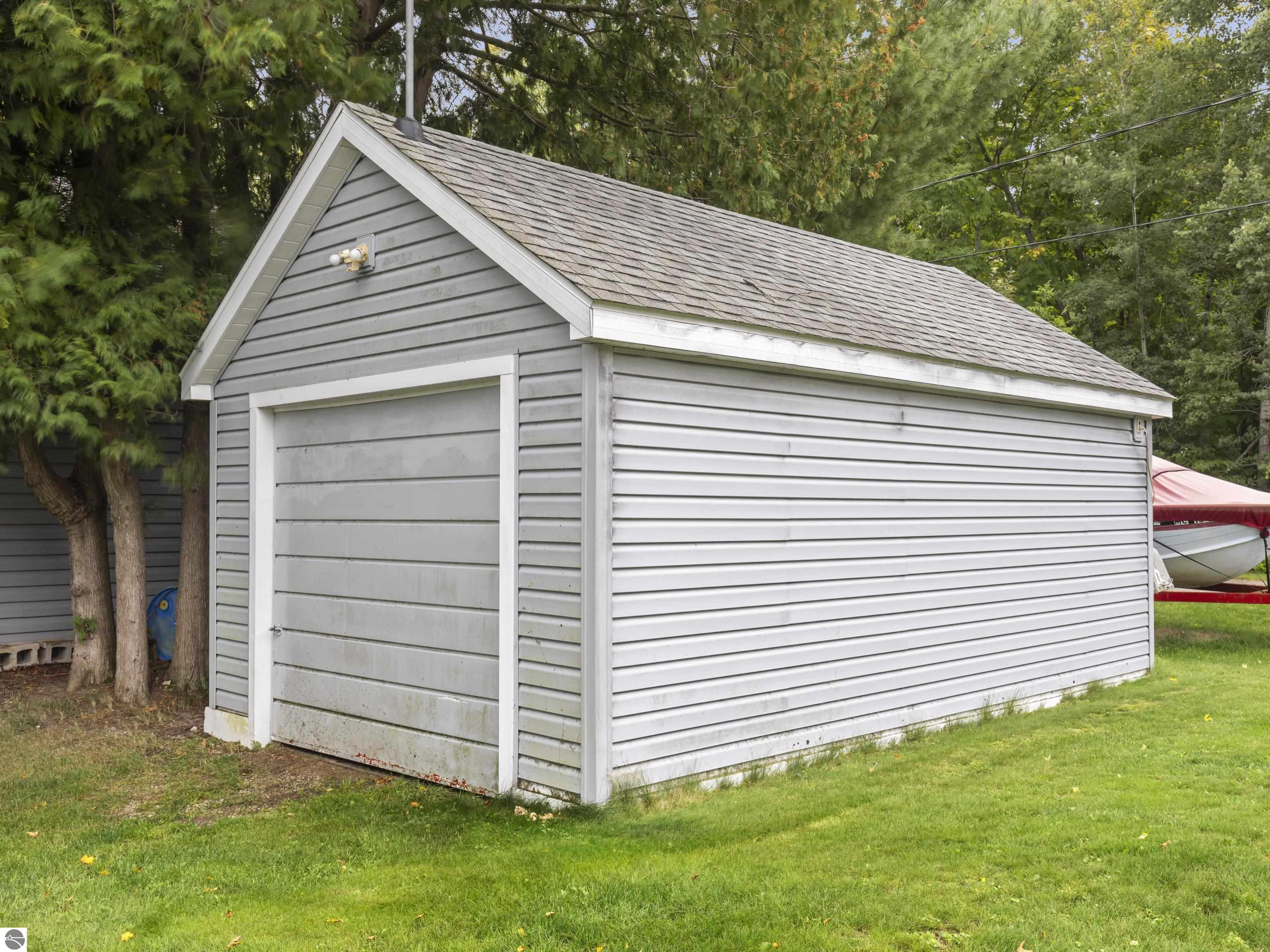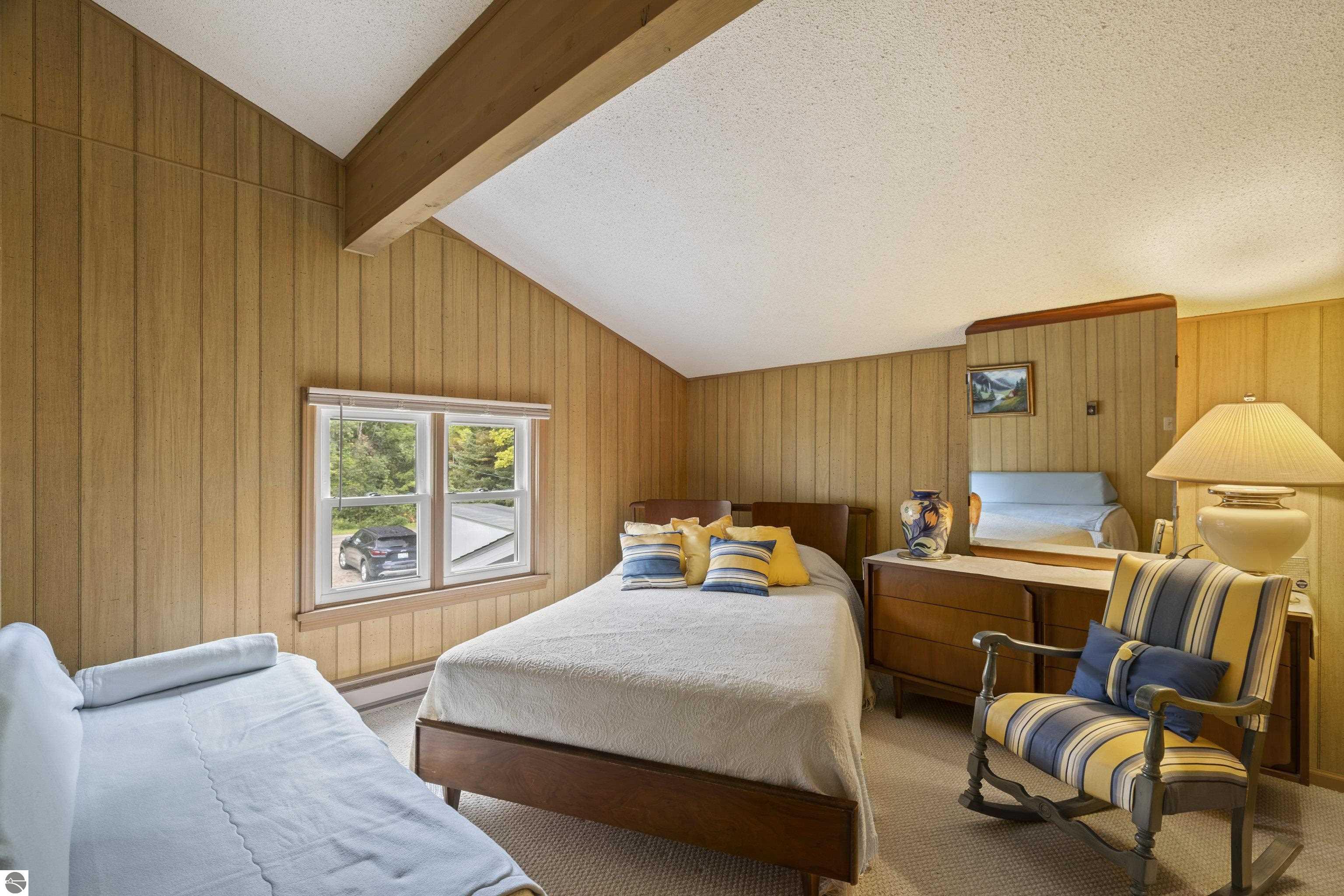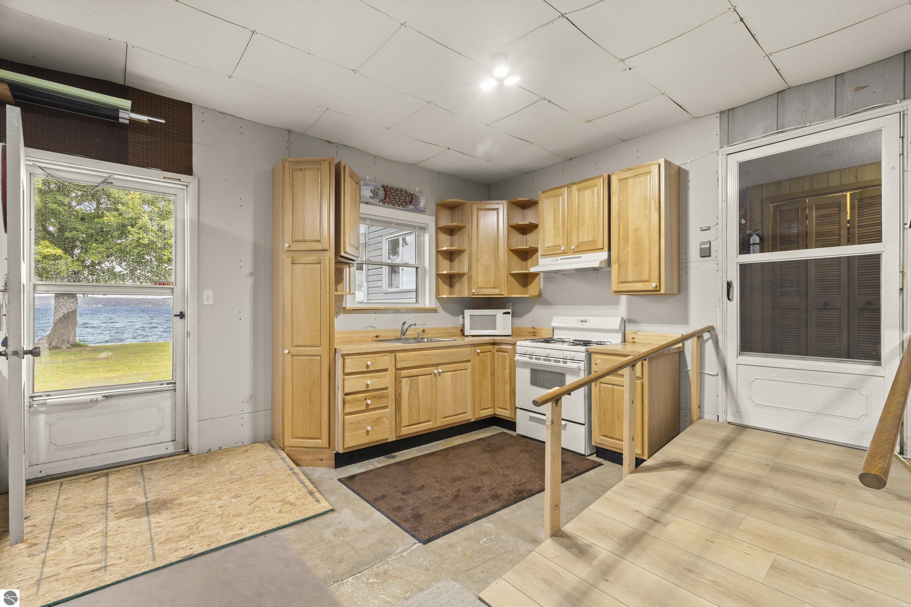Waterfront 3 BR, 2 BA home with 100 ft private frontage on all-sports Big Platte Lake near the Sleeping Bear Dunes National Lakeshore in Benzie County. Sweeping views across the entire lake from this quiet setting off the main road. Hard sandy-bottom lakefront with seawall and concrete ramp. Year-round home is turnkey with furnishings and features a lakeside sunroom, all new windows, new kitchen and appliances, and new maintenance free Trek decking. The living room cathedral ceiling rises above a fireplace with a WIFI controlled Majestic furnace insert for whole house heat upon demand. An upstairs loft lends bonus sleeping space. Refresh the interior with your personal touches. The 2-car, insulated, attached garage has a kitchen for summer get-togethers. Store the boats and yard equipment in the detached garage. Nice level front and back yards for recreation. Big Platte Lake is known for boating, swimming and fishing. Kayak down the Platte River to Lake Michigan from here.